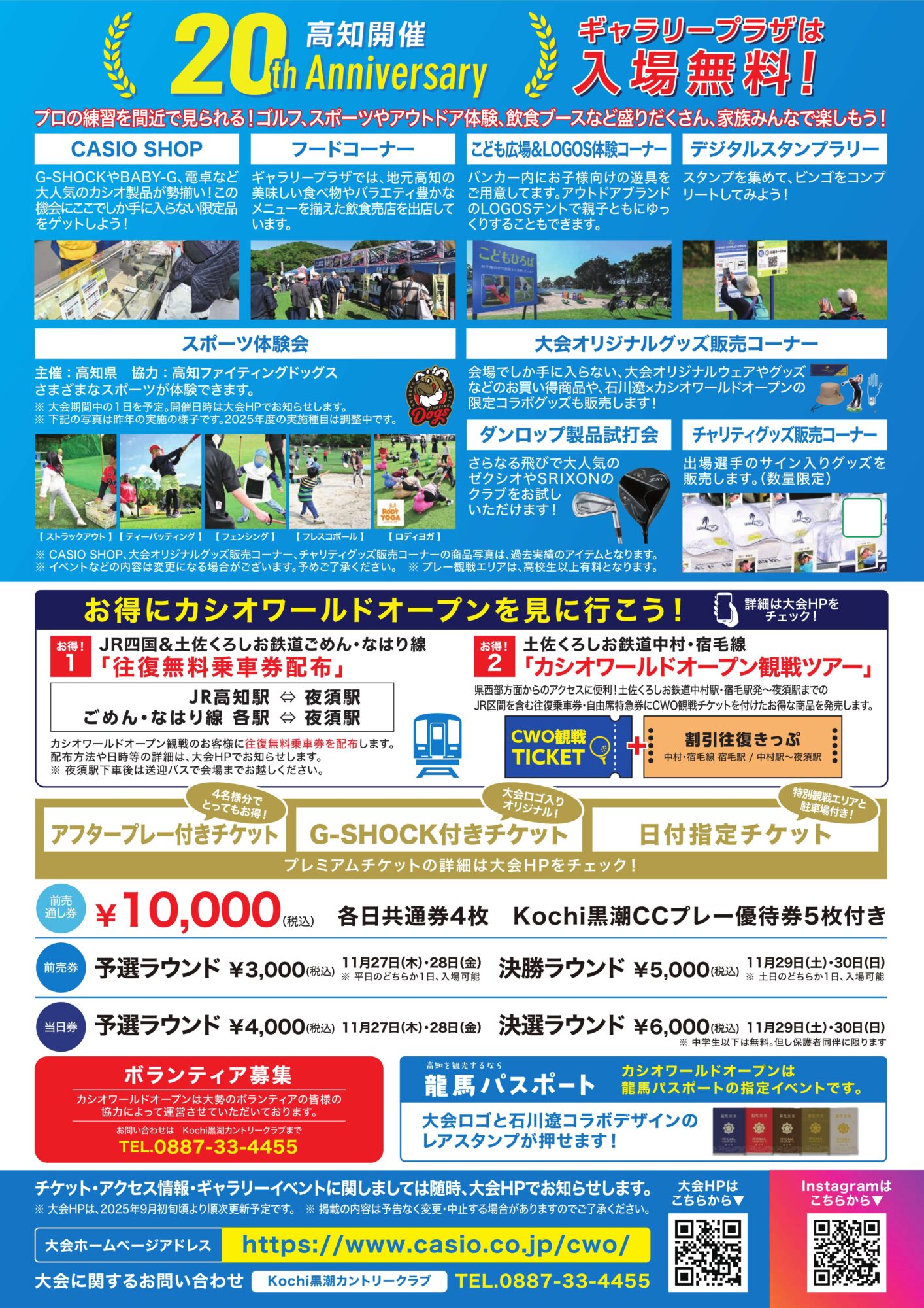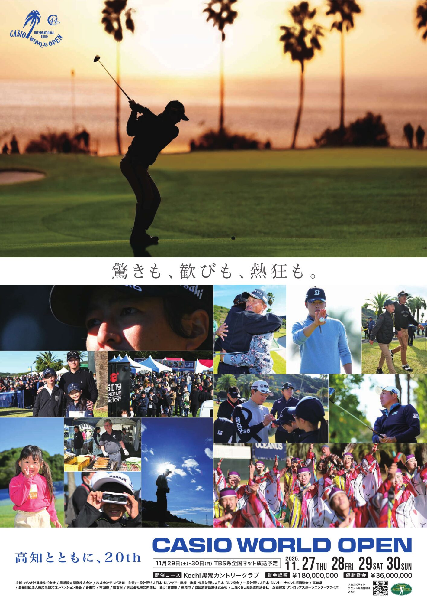 국내 남자 골프 투어의 종반전으로서, 대회 호스트 프로로 카시오 소속의 이시카와 요 선수를 비롯한 프로 골퍼가 상금왕이나 시드권을 걸어 열전을 펼치는 본 대회에서는, 이번, 고치 개최 20회째를 기념해, 20대 분에게 관전 에리어를 무료로 개방하는 것 외에, 각일 선착 2,000명에게 노벨티 상품을 배포합니다.