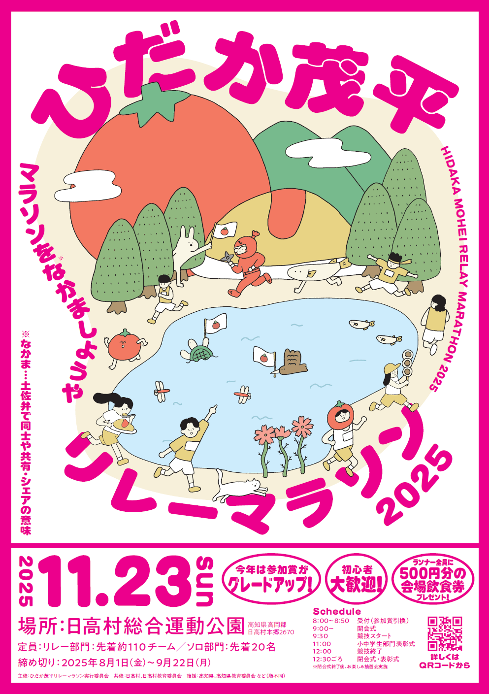 옛부터 촌민은 물론 넓게 현민에게 사랑받아, 사랑받고, 전해져 온 닌자·히시타 모헤이의 마을인 히다카무라.본 대회는, 가장 친밀한 러닝을 통해 「건강하고, 모두의 미소가 빛나는」를 목적으로 하고 있습니다.