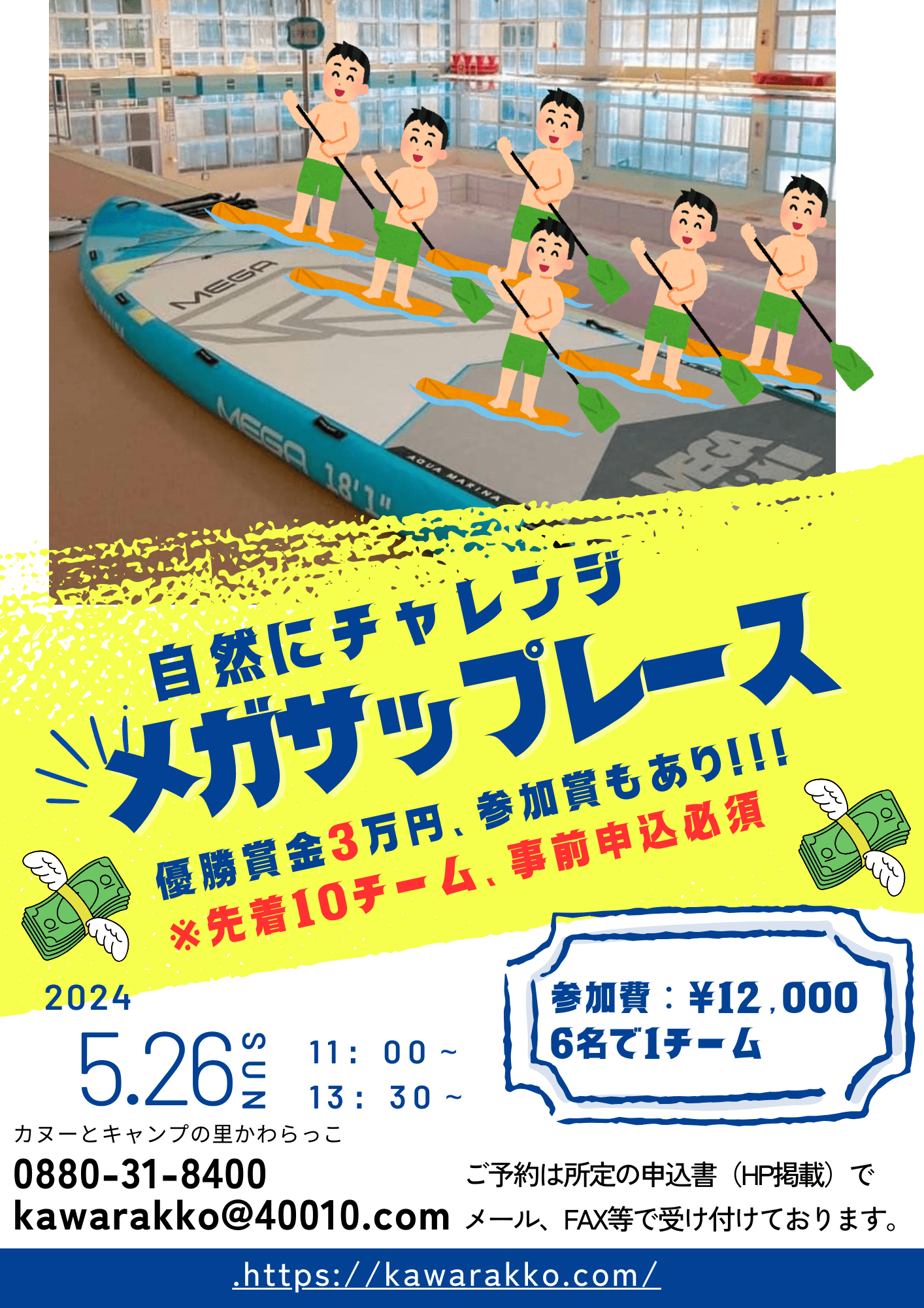 시만토시에 있는 「카누와 캠프의 마을 카와라코」에서, 카와라코무라 축제에서 제1회 메가 삽 레이스가 개최됩니다.우승 상금은 3만엔, 참가상도 있습니다.초대 후, 꼭 참가해 주세요.