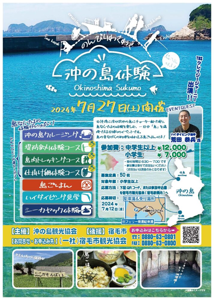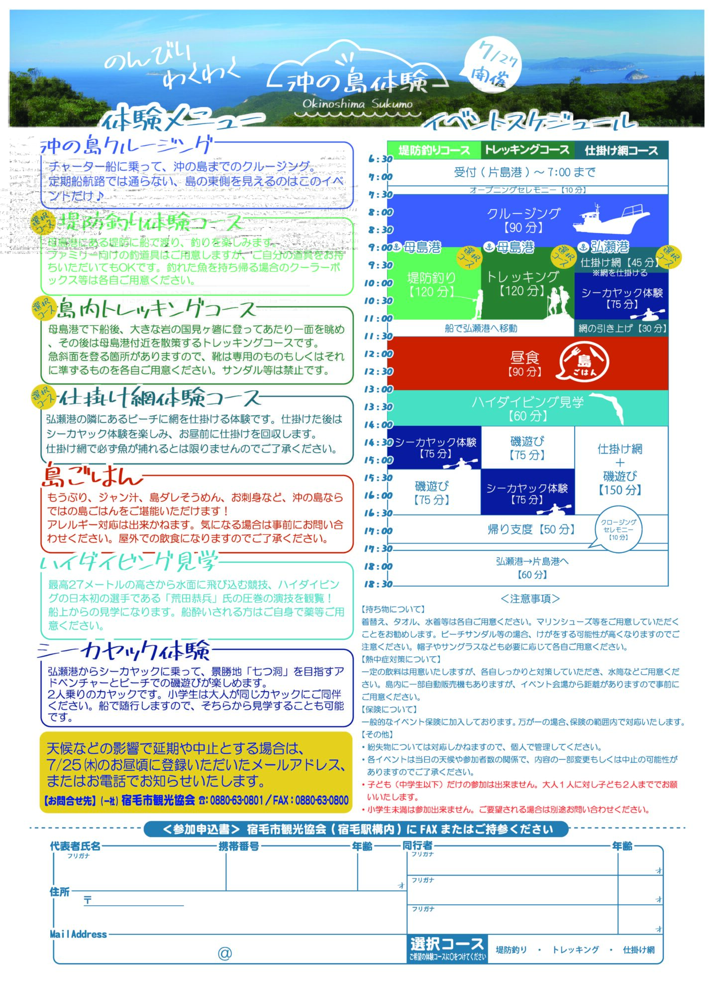 스쿠모만에 떠 있는 바다의 섬에 전세기선으로 건너가 섬 특유의 체험을 즐기는 하루 종일 「섬」을 만끽할 수 있는 당일치기 이벤트입니다.섬의 옛날 요리 섬 밥도 만끽할 수 있으므로, 꼭 참가해 주세요.
