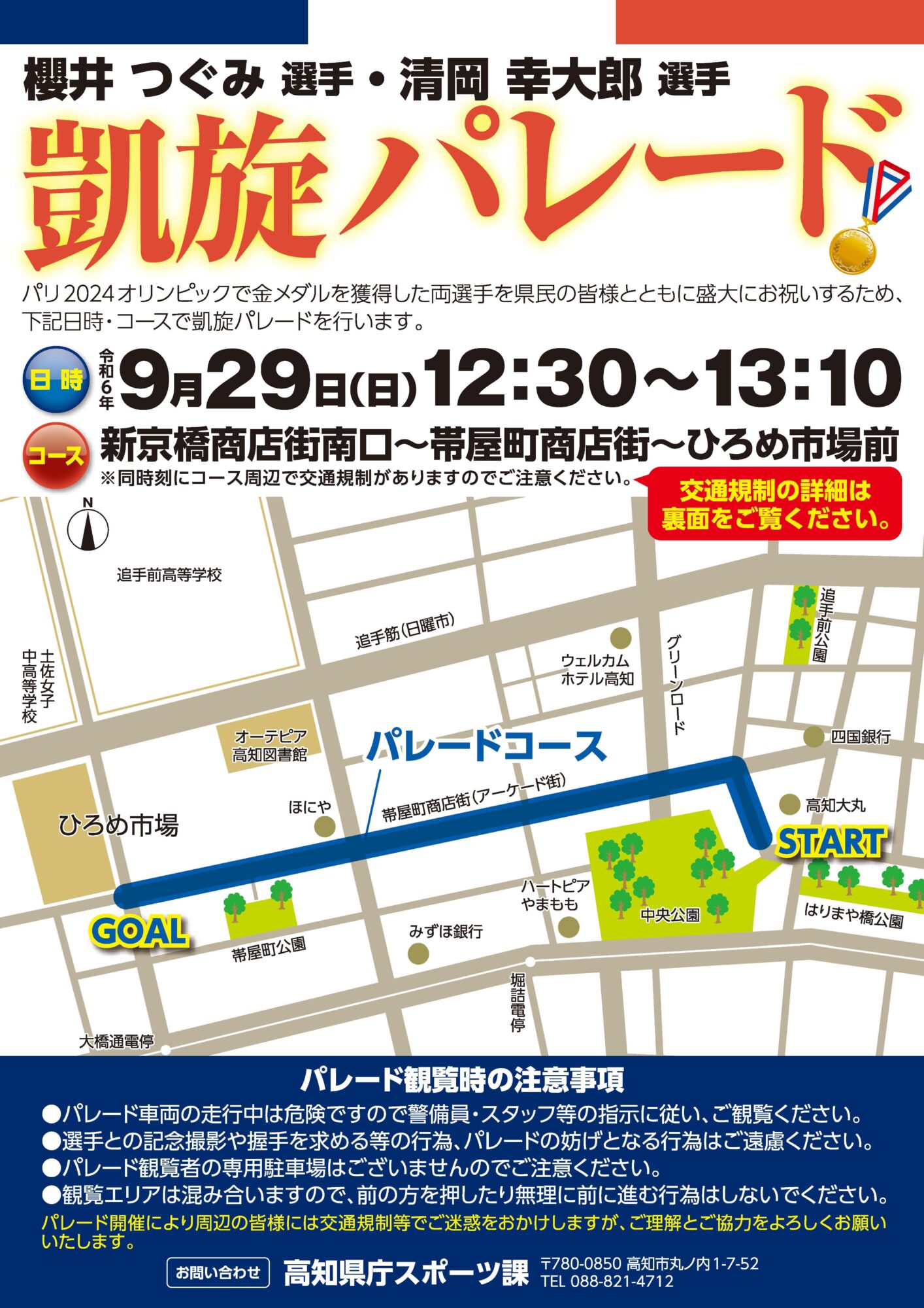 파리 2024 올림픽에서 금메달을 획득한 사쿠라이 선수·키요오카 선수를 현민 여러분과 함께 성대하게 축하하기 위해 개선 퍼레이드를 실시합니다.
