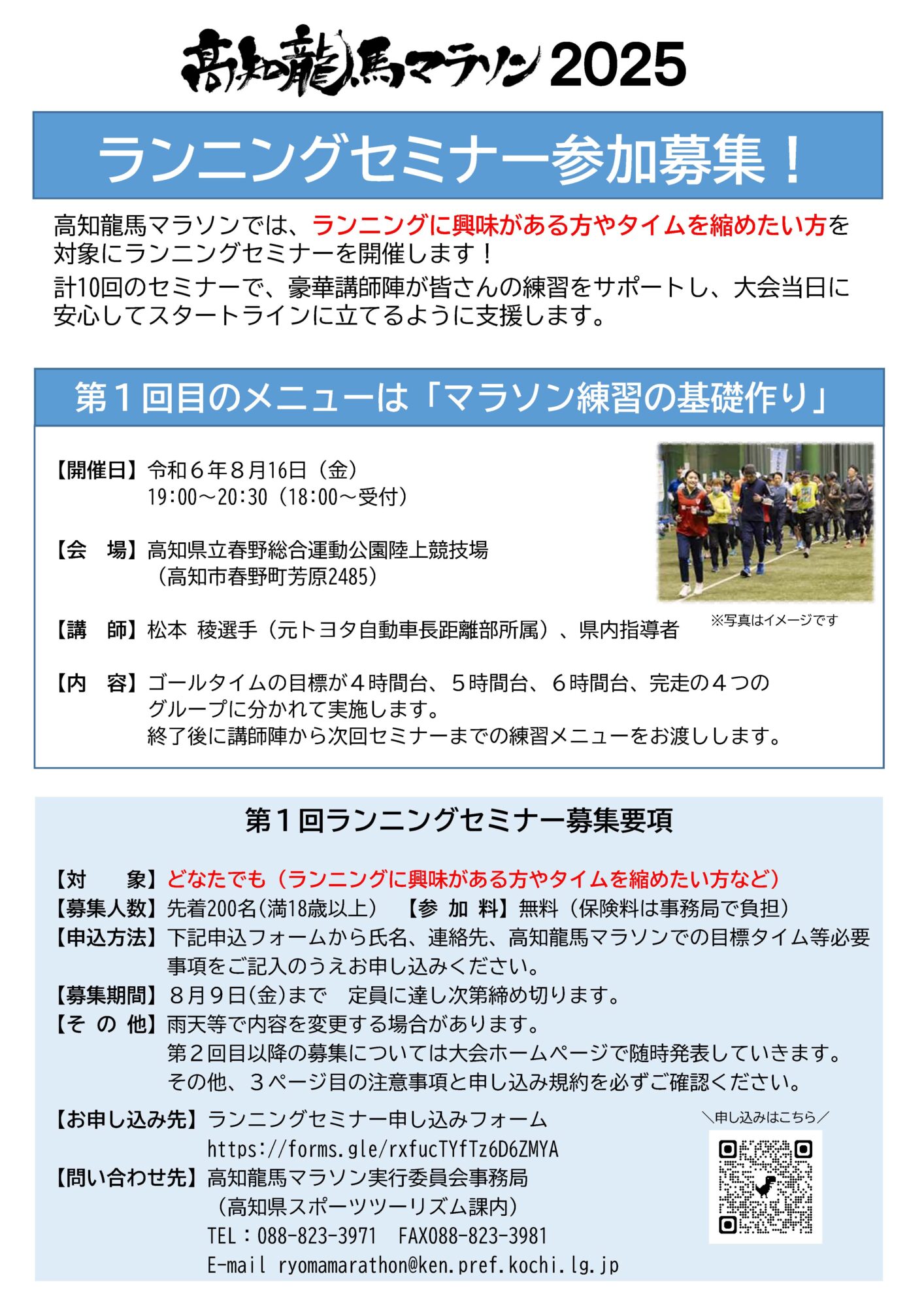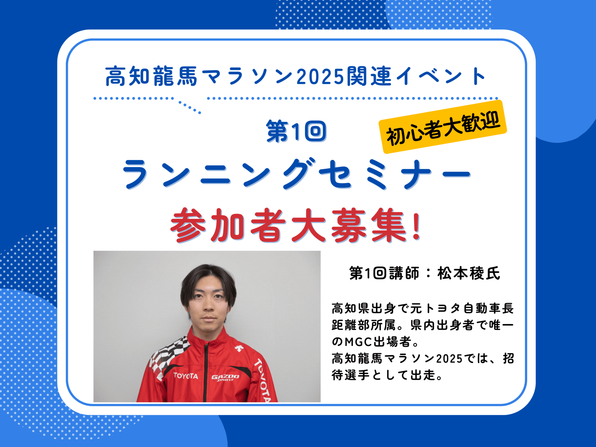 고치 료마 마라톤 2025 대회 어드바이저의 김철히코씨를 비롯해, 고치현 출신으로 전 도요타 자동차 장거리부 소속의 마츠모토 료씨, 본현에서 계속적으로 합숙을 실시하고 있는 토에넥 육상 경기부, 2024 하코네 역전에서 종합 우승을 완수한 아오야마 학원 대학 육상 경기부 등이 맡습니다.제1회의 강사는, 마츠모토 료씨입니다.