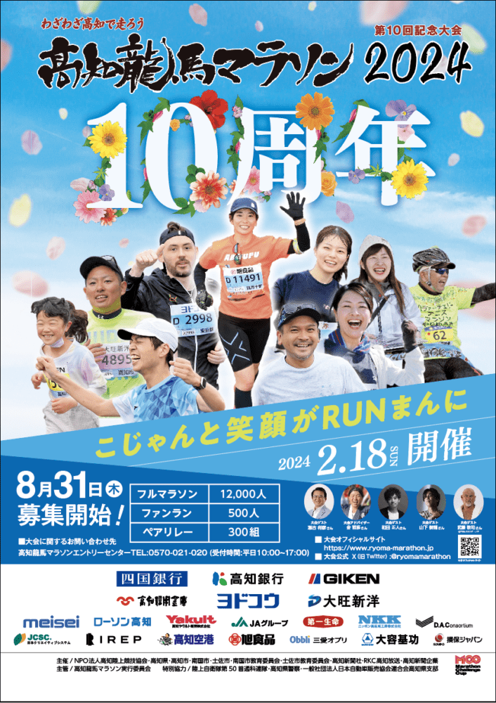 고치 료마 마라톤은, 본현의 강점인 사람의 따뜻함과 환대, 풍부한 자연이나 고치만의 음식을 즐길 수 있는 대회입니다.제10회째의 고비가 되는 이번 대회에서는, 풀 마라톤과 팬런에 가세해, 마라톤 초보자에게도 부담없이 참가해 주시려고 새롭게 페어 릴레이의 종목을 마련했으므로, 꼭, 이 기회에 도전해 보세요