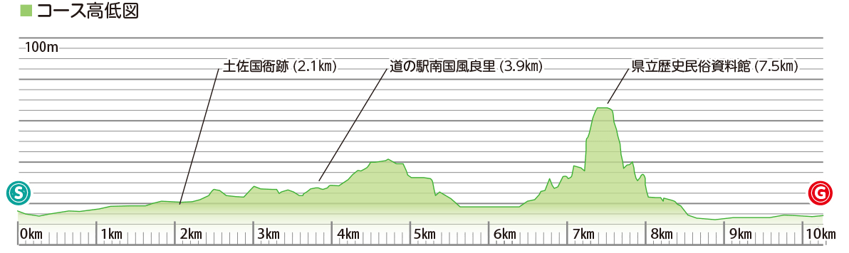 약 1300년 전의 율령 시대에 국부가 놓여져 토사의 정치 경제의 중심지로서 번창한 「도사의 마호로바」라고 불리는 지역을 둘러싼 코스「도사 국아 자취」, 「기누키노 저 터」, 「오카 도요 성터」 「현립 역사 민속 자료관」 등 남국시의 역사에 접할 수 있는 것 외에, 미치노에키 남고쿠 후라리나 니시지마 원예 단지에서 음식이나 쇼핑도 즐길 수 있습니다.