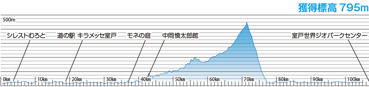 고저차가 적고, 호쾌한 태평양을 만끽할 수 있는 해안선과 고저차가 많은 산간부를 즐길 수 있는 코스도중에 있는 해양심층수를 사용한 시레스트 무로토에서는 당일치기 이용도 가능해 피곤한 몸을 치유할 수 있다.