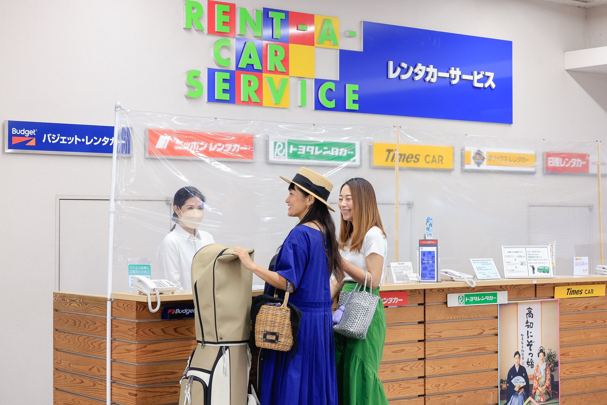 공항 도착구를 나와 바로 눈앞의 로비에 렌터카 접수 카운터가 있습니다.원활하게 렌터카를 이용하려면 각 렌터카 회사에 사전 예약이 좋습니다.카운터에서 각 렌터카 회사에 예약명·예약 내용을 전하면 렌터카 회사 직원이 각 점포까지 안내해 줄 테니 로비에서 기다리세요