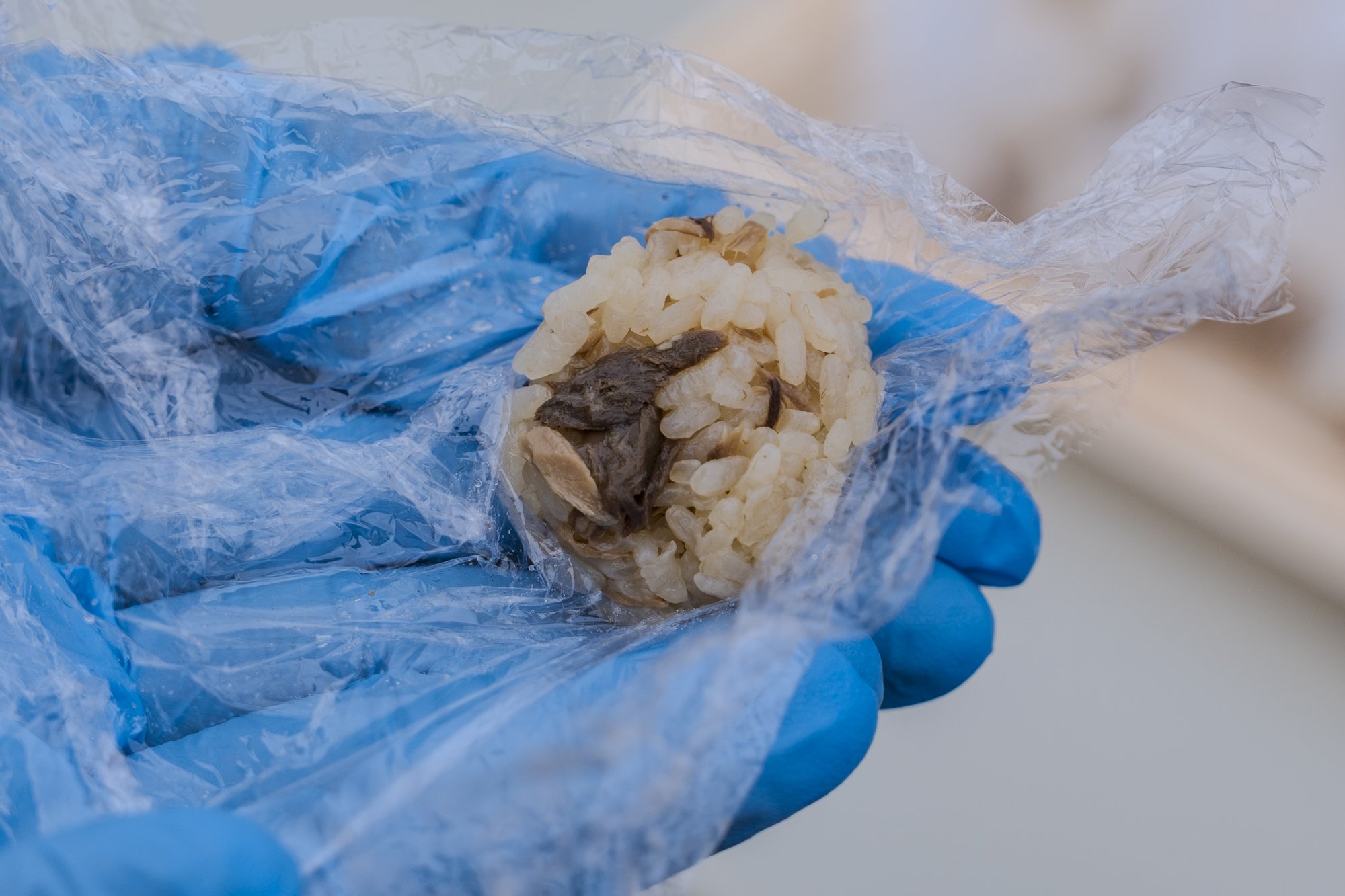 가다오메시란, 도사의 가다를 사용한 간장 풍미의 밥솥 밥을 꽉 주먹밥으로 한 것.