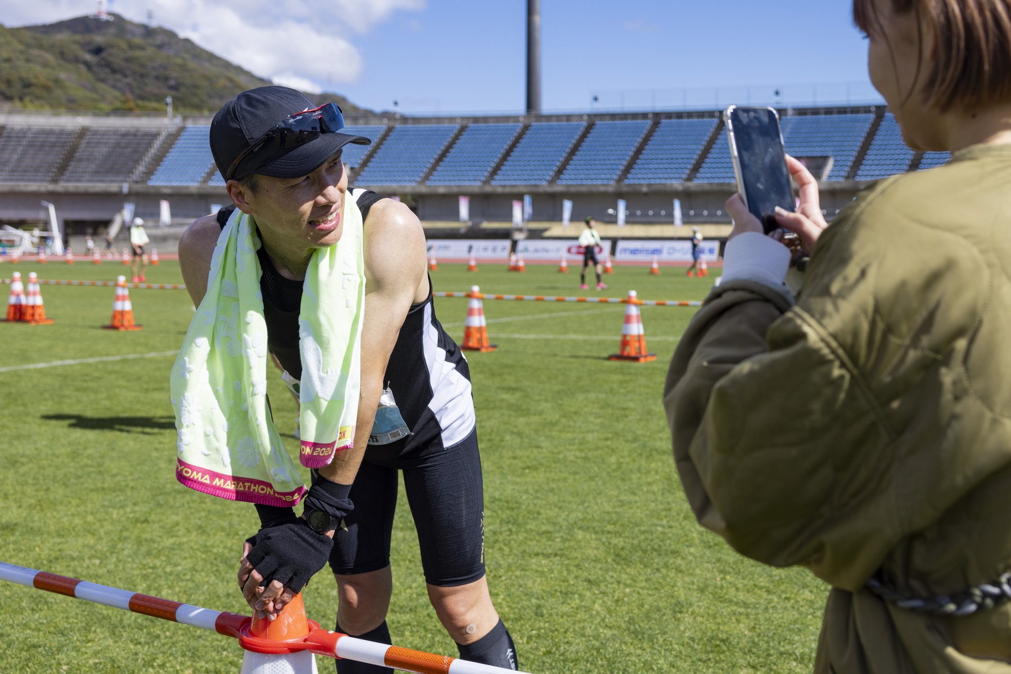 토비의 기록은 3시간 5분 54초.유감스럽게도 서브3의 달성은 못했지만, 남자 종합 158위, 남자의 30대에서는 44위라고 하는 대건투입니다!골 후에 숨을 가다듬은 토비에게 완주 후 인터뷰.