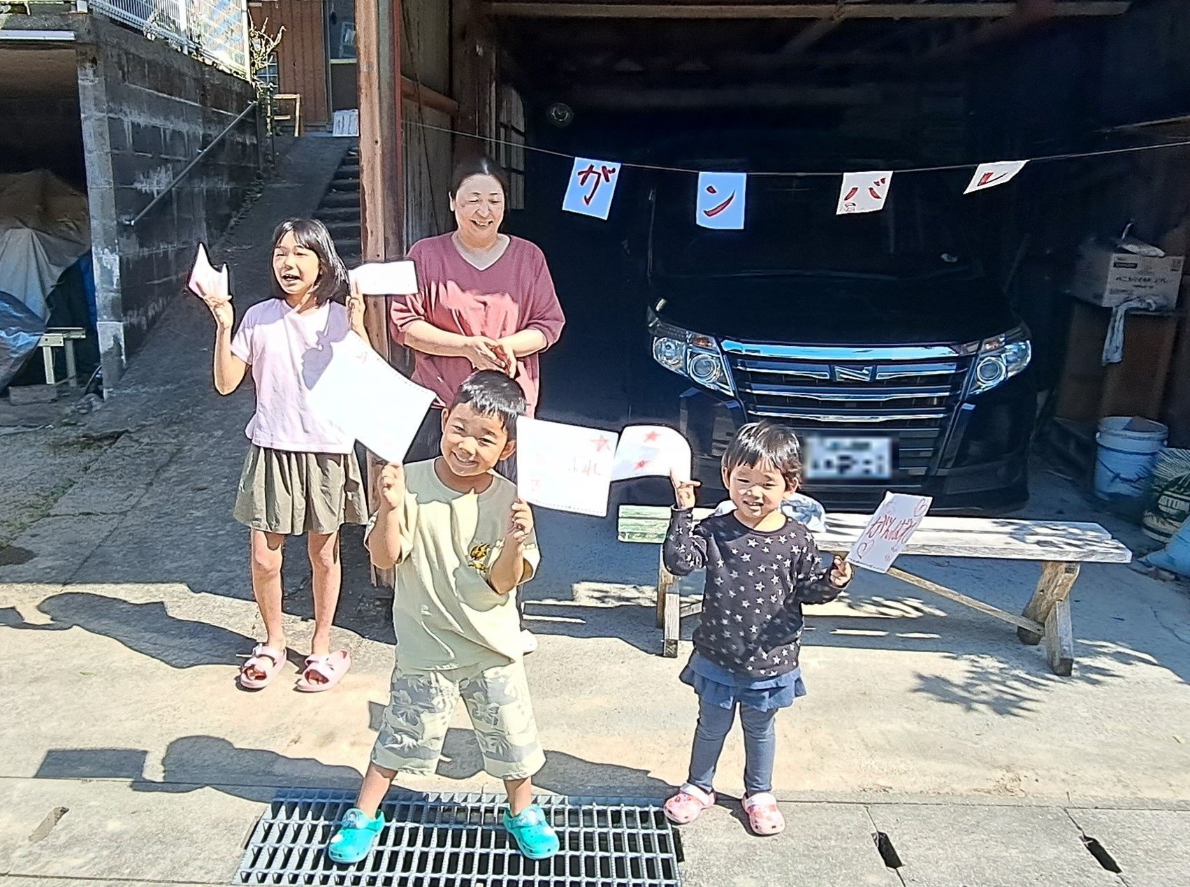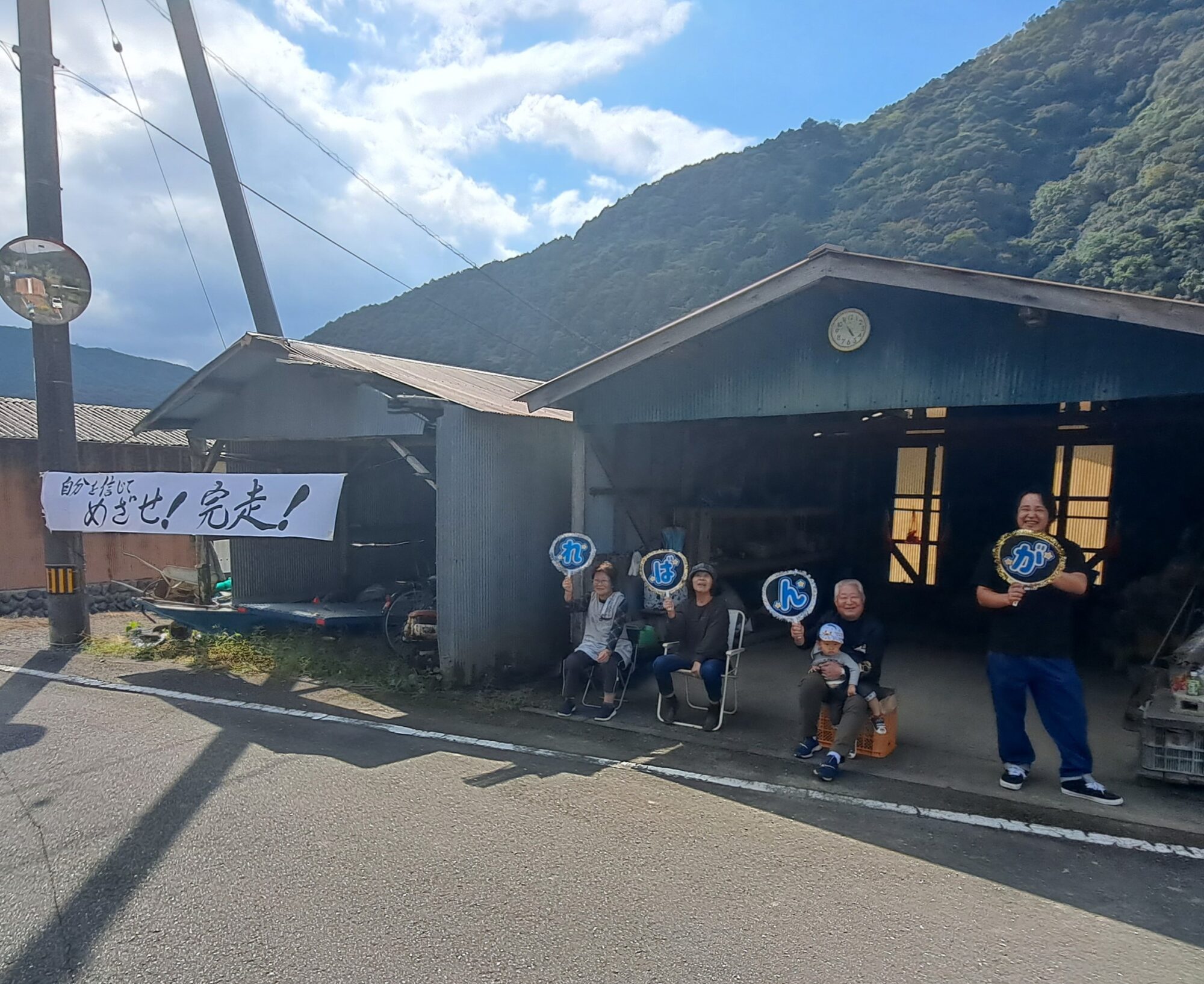 에이드 스테이션의 성원에 가세해, 자택 앞에서 오리지널의 횡단막이나 부채, 소기 등, 열심히 응원하고 있는 모습, 여러분의 미소는, 러너의 피로가 날아갑니다