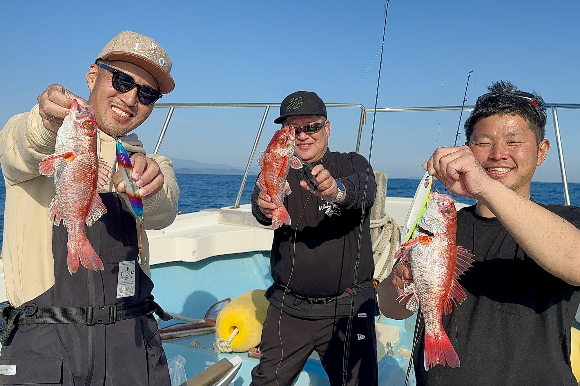 참가자는 경쟁적으로 메탈 지그를 투입합니다.메탈 지그가 해저에 착착하면 장대를 천천히 크게 흔들어 물속에 있는 메탈 지그를 움직여 목걸이를 초대합니다.최초로 낚아 올린 것은, 고치현의 이웃 도쿠시마현에서 참가한 여성