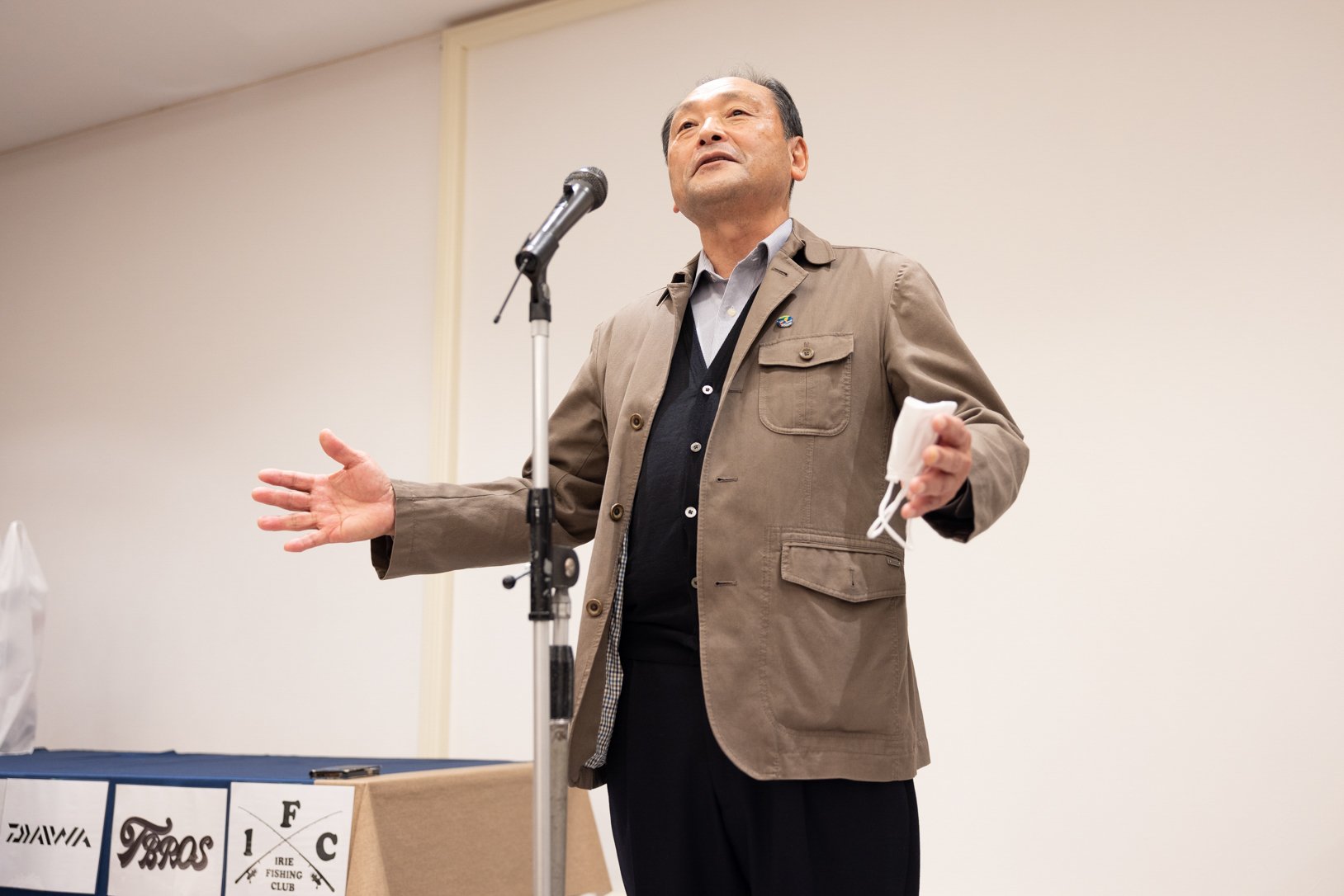 “오늘은 북쪽은 아오모리에서 남쪽은 미야자키까지, 먼 곳으로부터 많은 분들에게 대회에 참가해 주셔, 성대하게 개최할 수 있었습니다.여러분 감사합니다. 또 낚시도 훌륭했던 것 같아 축하드립니다.무로토시는 유네스코 지오파크에 인정된 귀중한 지형을 가지고 있습니다.국도에서는 그 특이한 대지나 산, 바다를 바라볼 수 있습니다.날씨에 따라 산이나 바다의 색, 빛은 전혀 다르게 보입니다.오늘 여러분이 편하게 된 도구로도 일본에서 가장 연안에서 근처에 심해 있는 무로토만의 물고기입니다.꼭 앞으로도 제3회, 4회와 이 대회를 계속해, 더 큰, 더 메이저 대회로 해 가고 싶습니다.아무쪼록 앞으로도 잘 부탁드리겠습니다. 」