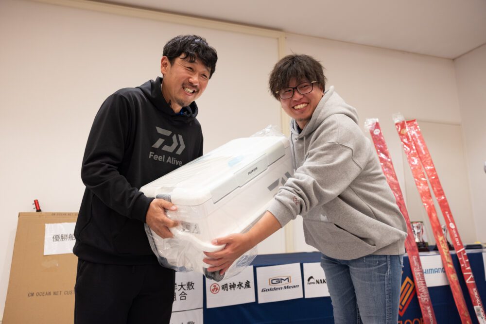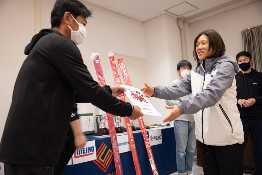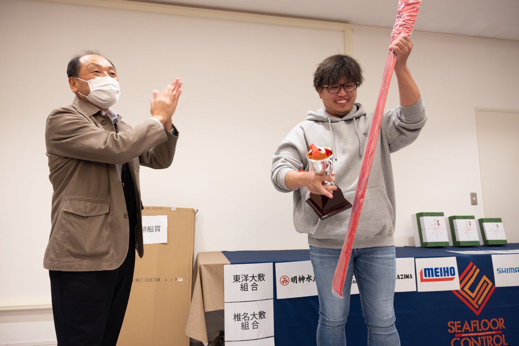 계속되는 표창식에서는, 다어종 부문, 선장상의 발표 후, 5위부터 1위까지가 발표되었습니다.4위부터 1위까지의 차이가 불과 50g이라는 혼전 속, 고치시로부터 참가의 요코타씨가 훌륭하게 우승을 차지했습니다.