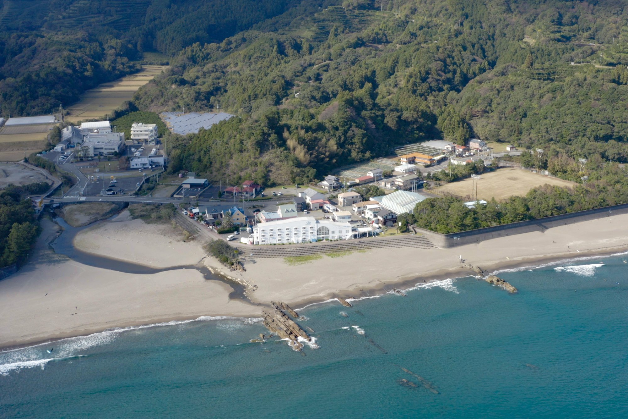 서핑의 프로나 아마추어의 전국 선수권을 비롯해 세계 대회도 개최되고 있는 전국 굴지의 서프 스폿 이쿠미 해안"서프 비치는 숙박 시설 등으로부터 조금 떨어져 있는 경우가 많습니다만, 생견해안은 눈앞에 펜션이나 음식점이 있어 서핑을 하는 환경으로서는 매우 좋습니다"라고 가나자와씨육지에서 왼쪽은 상급자를 위한 비치 브레이크가 있고, 우측은 초보자라도 즐길 수 있는 파도의 작은 포인트가 있는 것도 매력이라고 가르쳐 주었습니다.