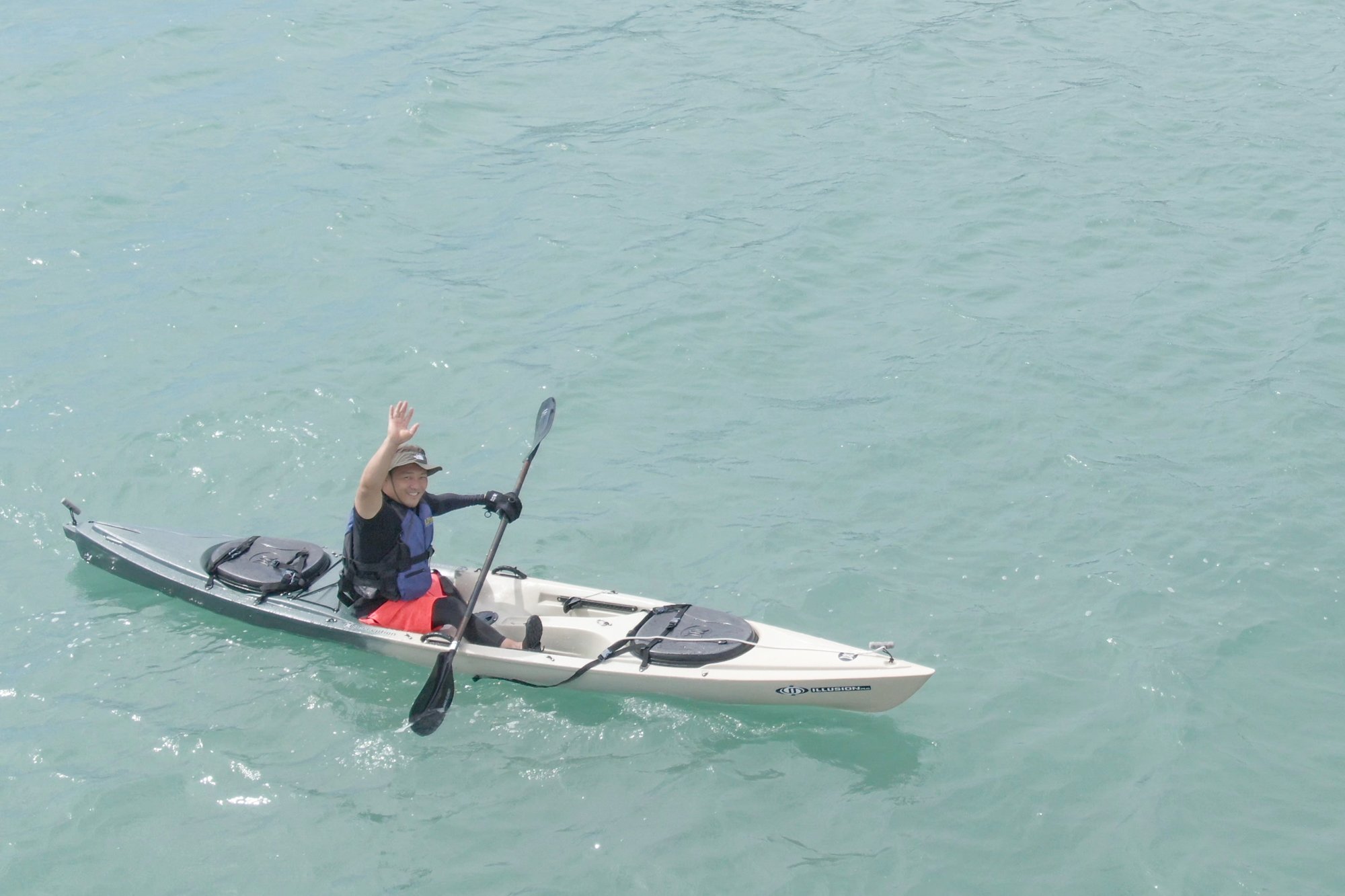 YASU 해역 클럽의 스탭 오카다씨에게 안내되어 이케씨는 구명조끼를 착용.또한 카약과 패들을 선택하고 눈앞의 만으로 향합니다.