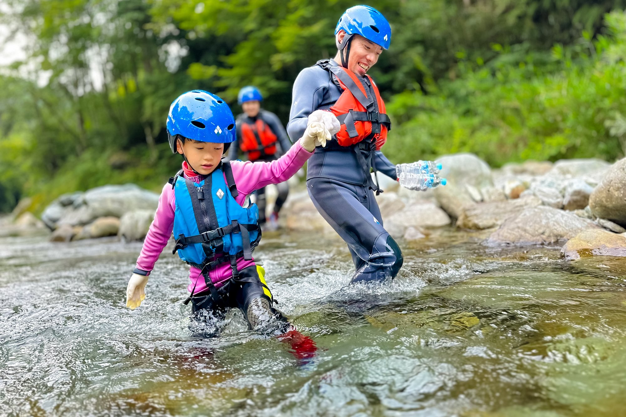 샤워 클라이밍(사슬 등반)은 여름에 딱 맞는 액티비티시코쿠를 대표하는 청류의 하나·요시노가와의 지류로 부모와 자식이 강놀이를 마음껏 즐겼습니다.