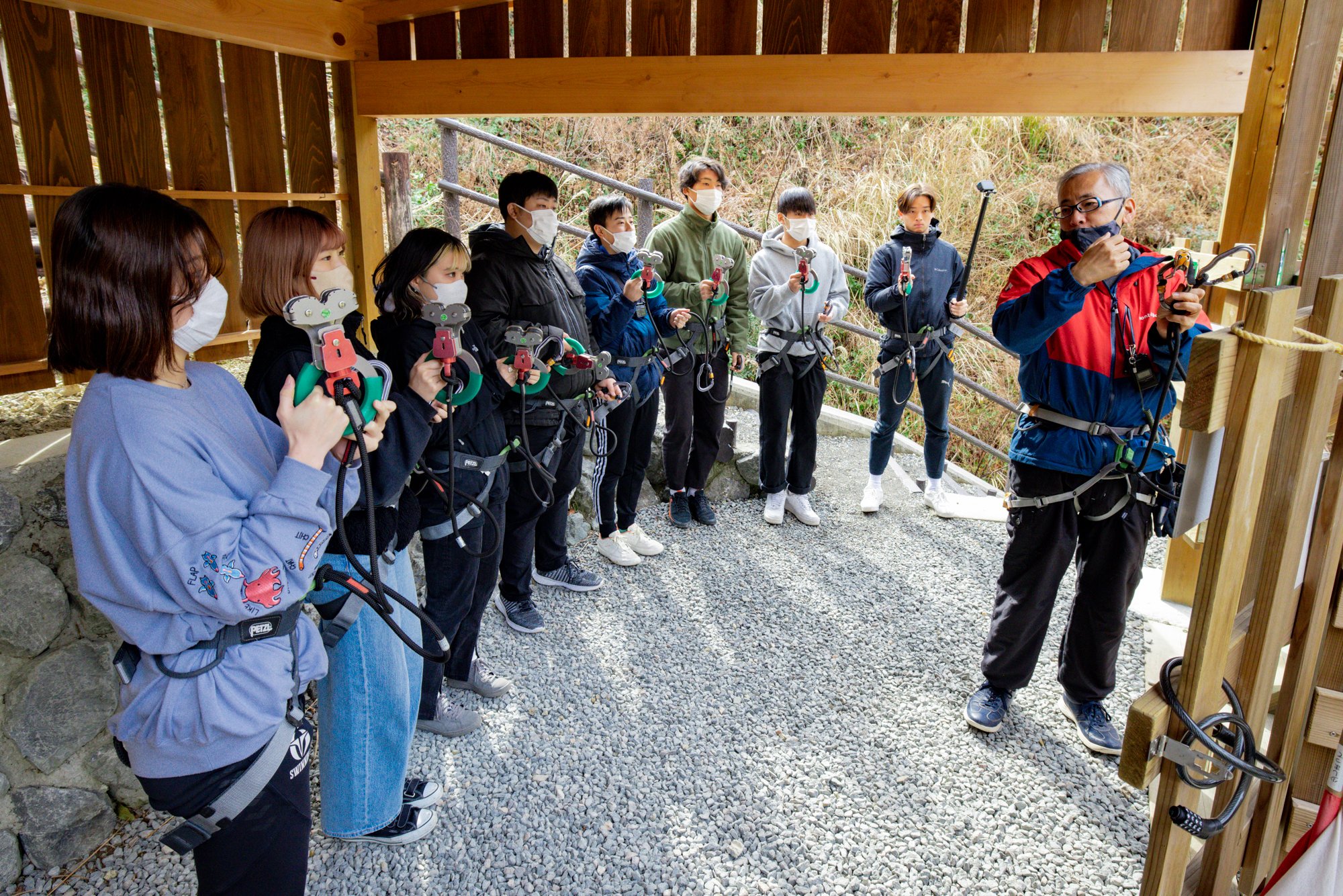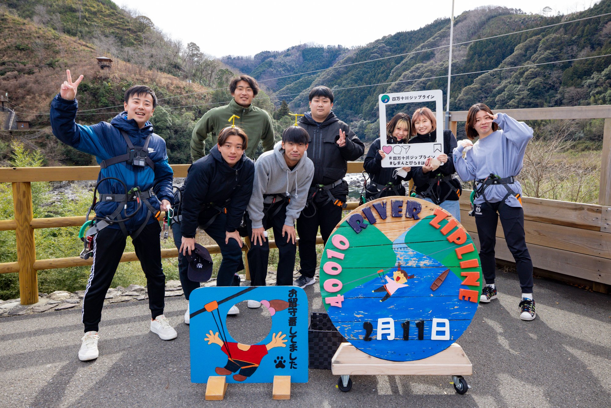 「미치노에키 시만토와 오와」의 부지내에 있는 시만토가와 지플라인의 종합 안내소를 방문합니다.체험 당일에는 8명의 학생들이 직접 렌터카를 몰고 도착했습니다.