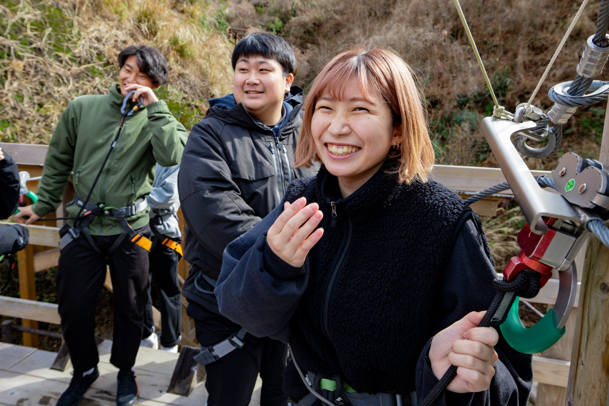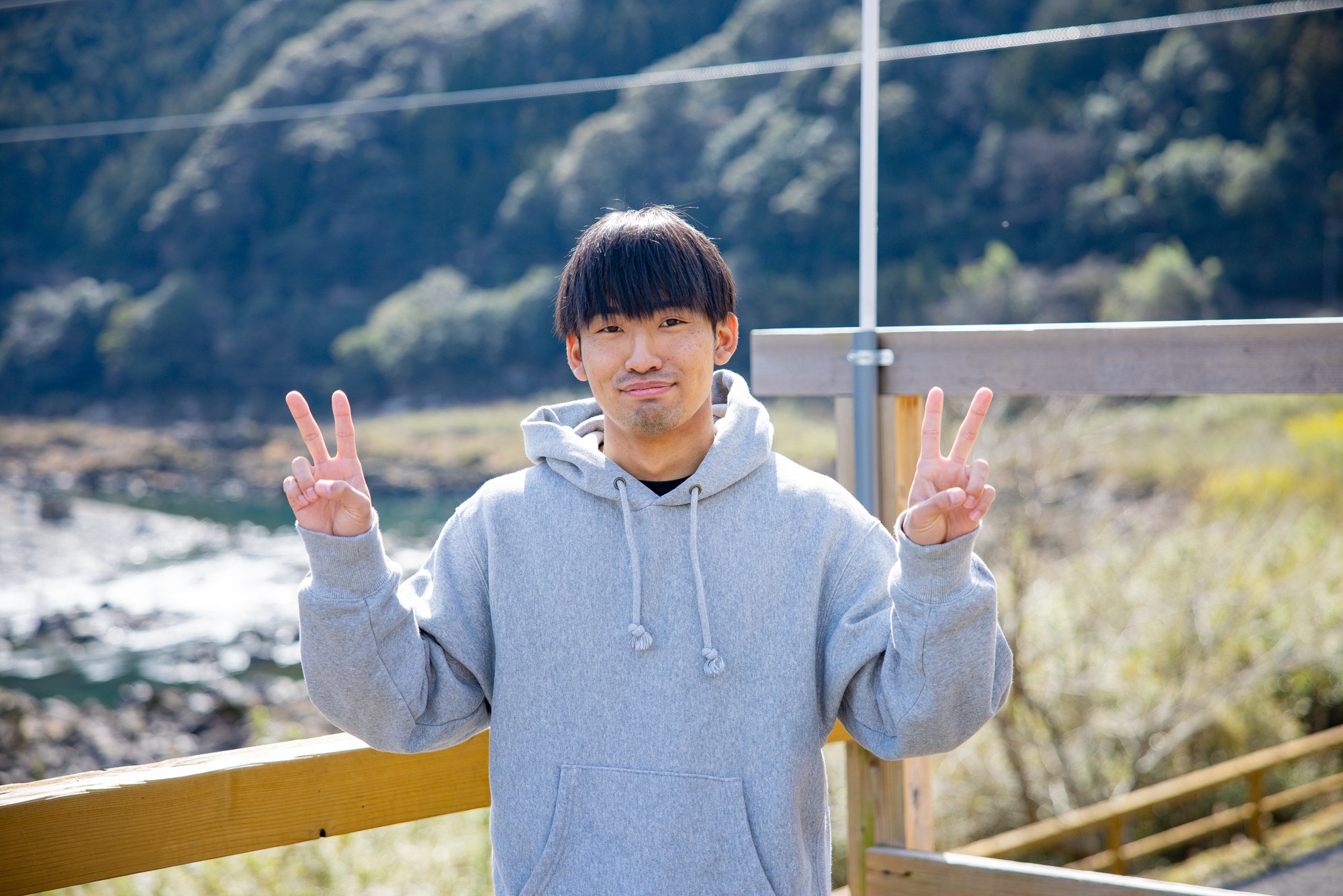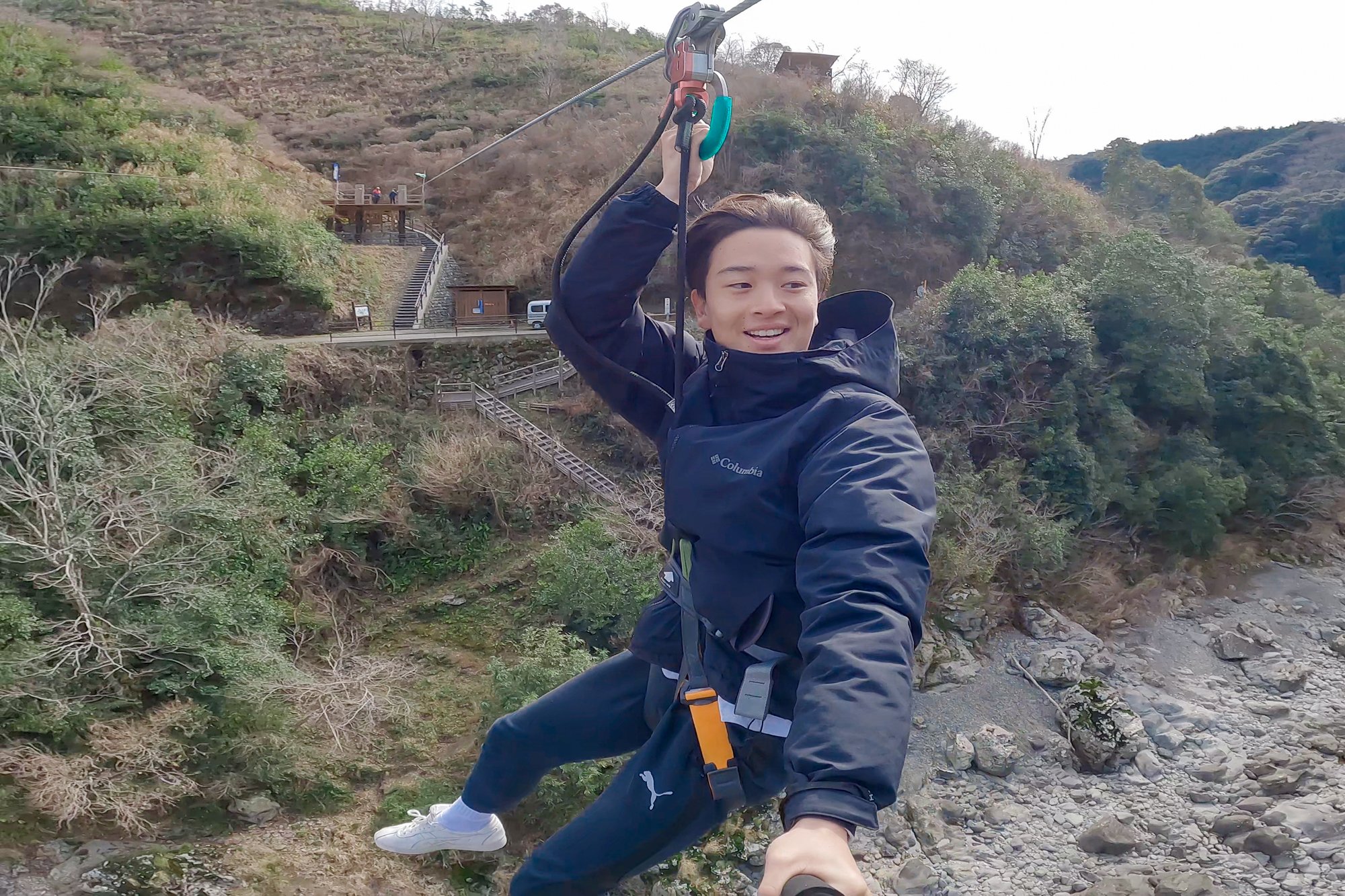 미소를 보이는 카츠오카 게이세이씨와, 고소공포증이라고 하는 우치다 하야스케씨 「처음에는 걱정이었지만, 무서운 것보다 즐거운 쪽이 컸습니다!강이 비쳐 보여서 매우 깨끗합니다.여기서 밖에 즐길 수 없는 경치라고 생각했습니다」라고, 만족스러운 모습.