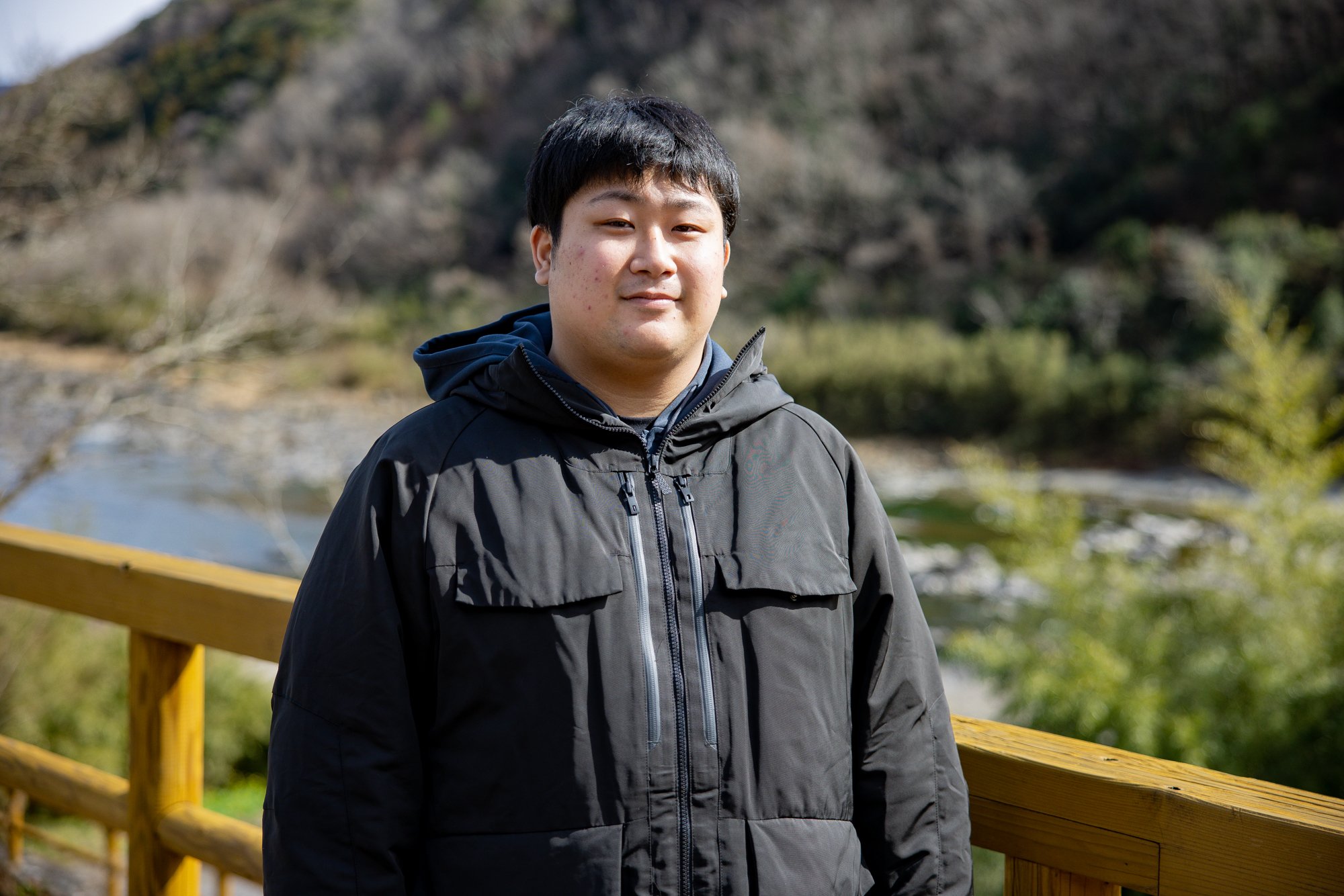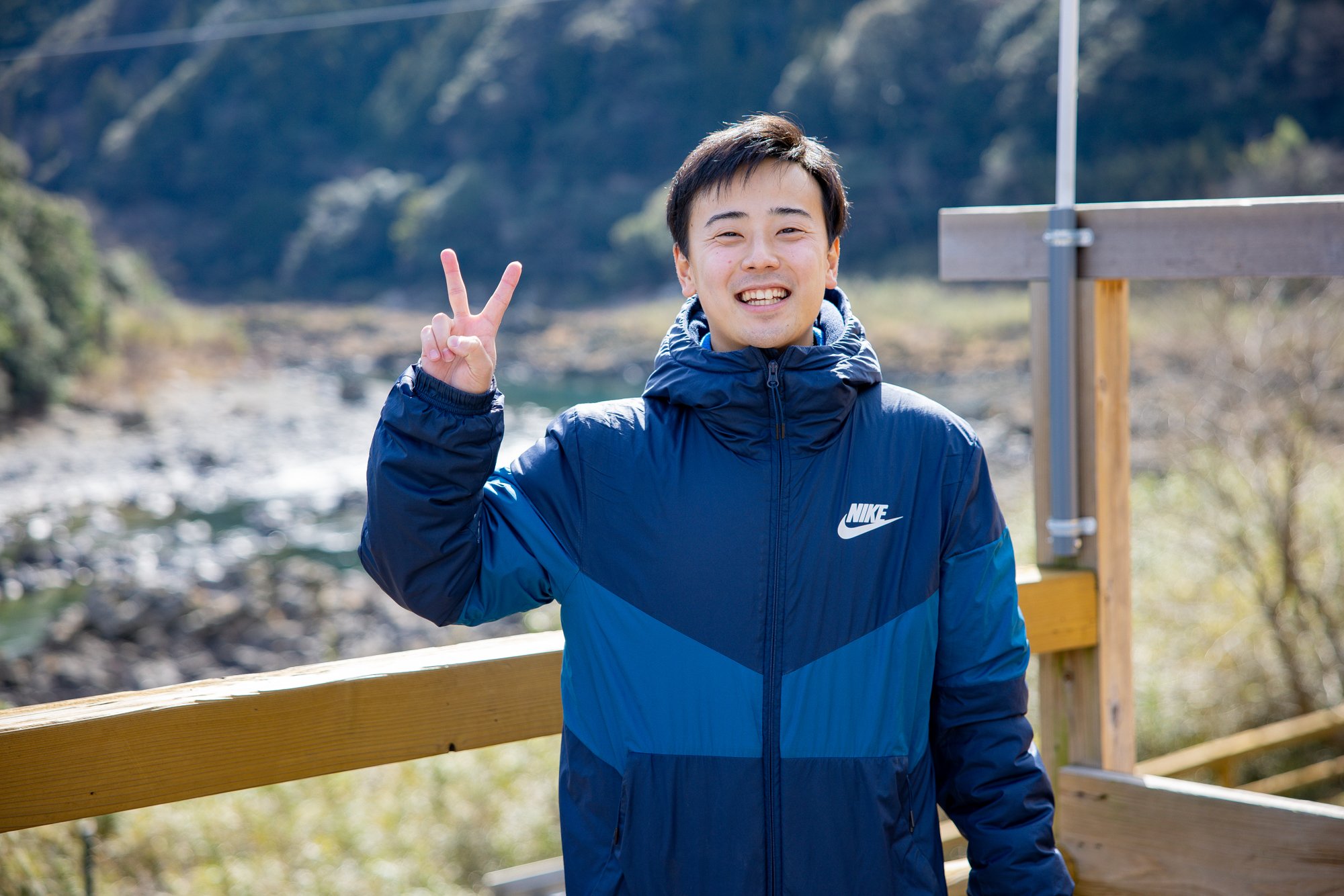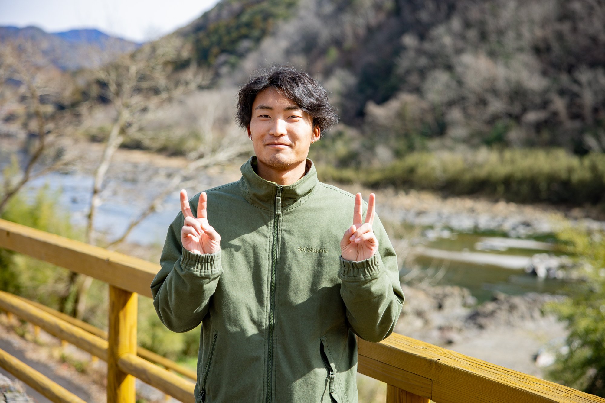 미소를 보이는 카츠오카 게이세이씨와, 고소공포증이라고 하는 우치다 하야스케씨 「처음에는 걱정이었지만, 무서운 것보다 즐거운 쪽이 컸습니다!강이 비쳐 보여서 매우 깨끗합니다.여기서 밖에 즐길 수 없는 경치라고 생각했습니다」라고, 만족스러운 모습.