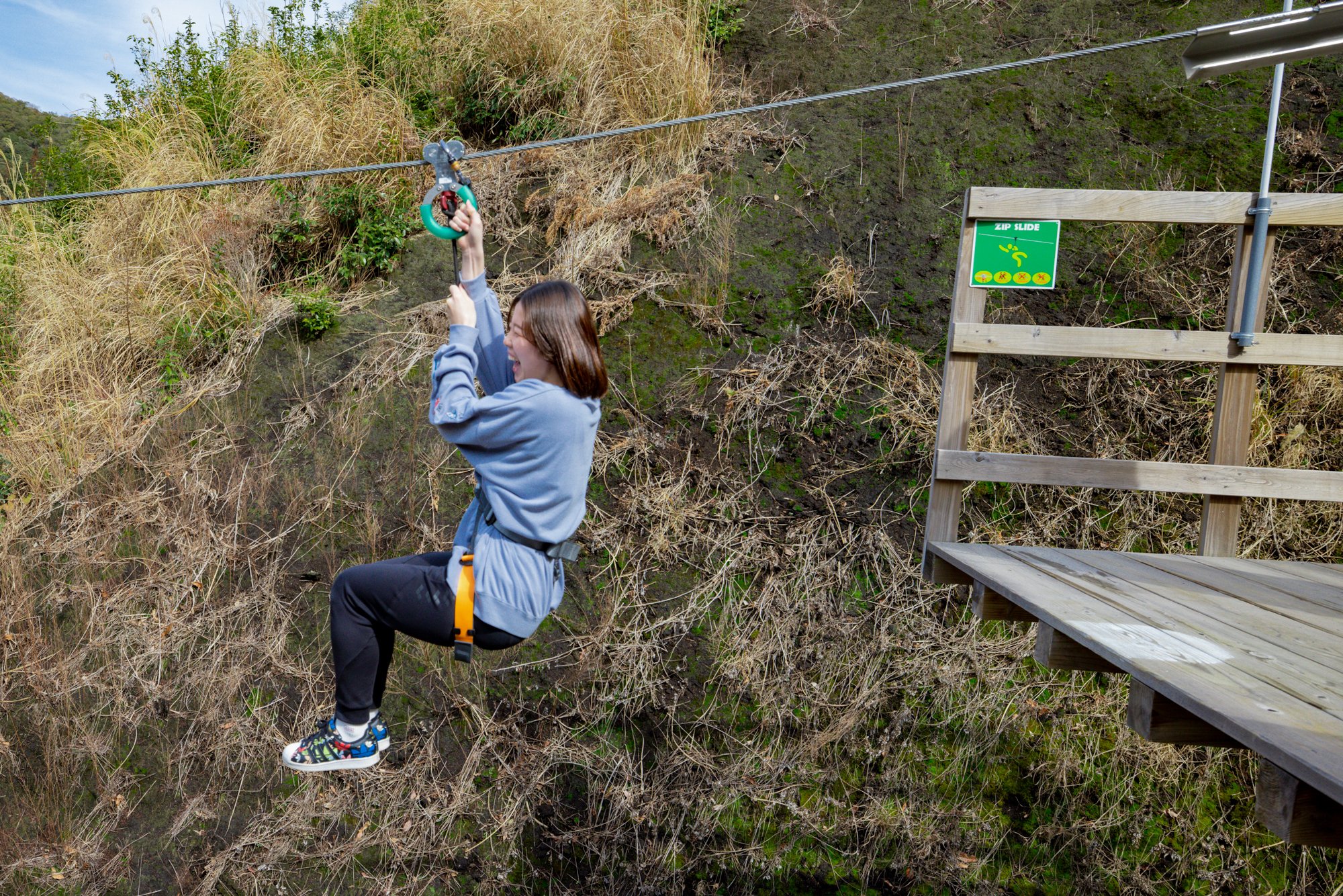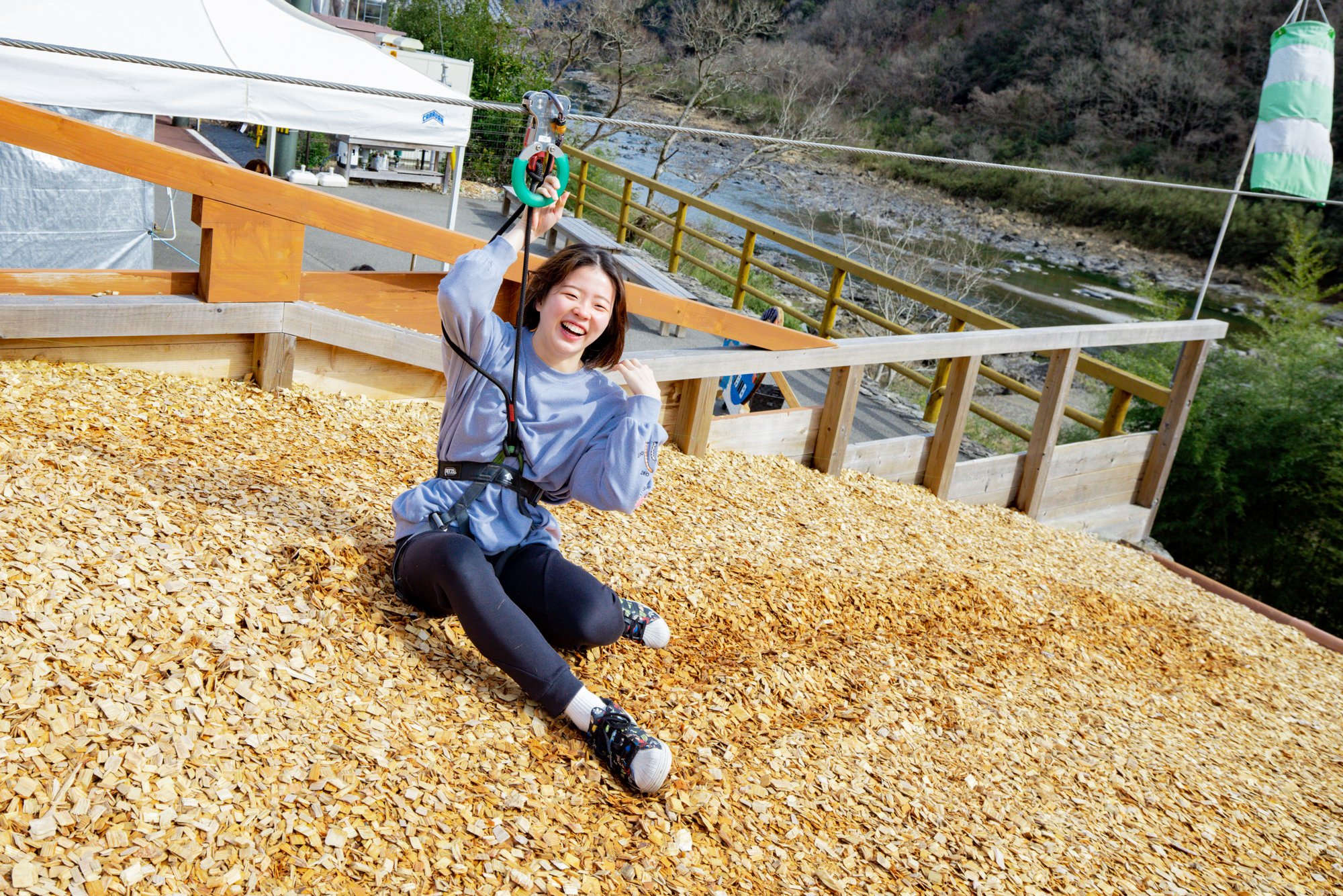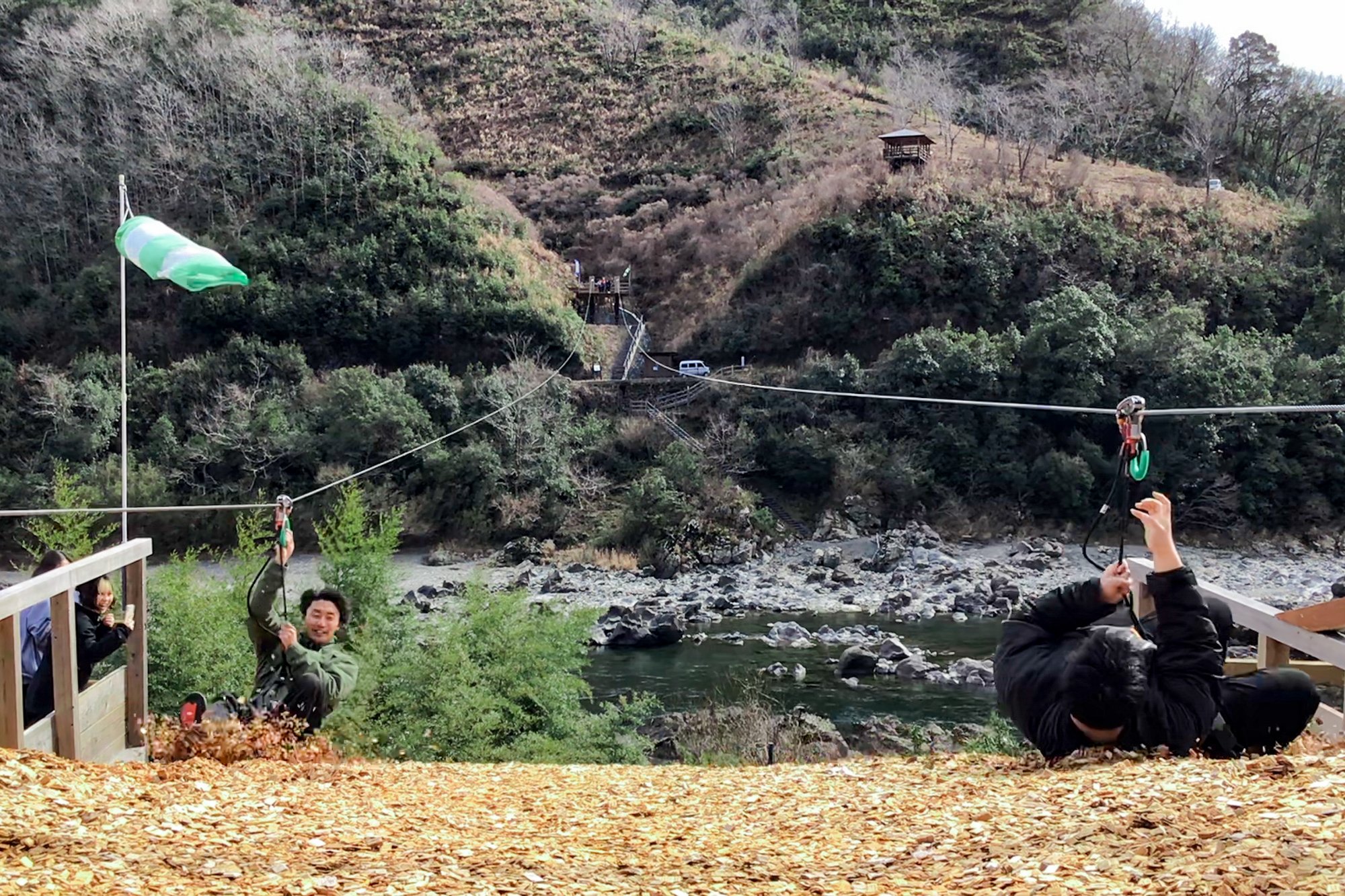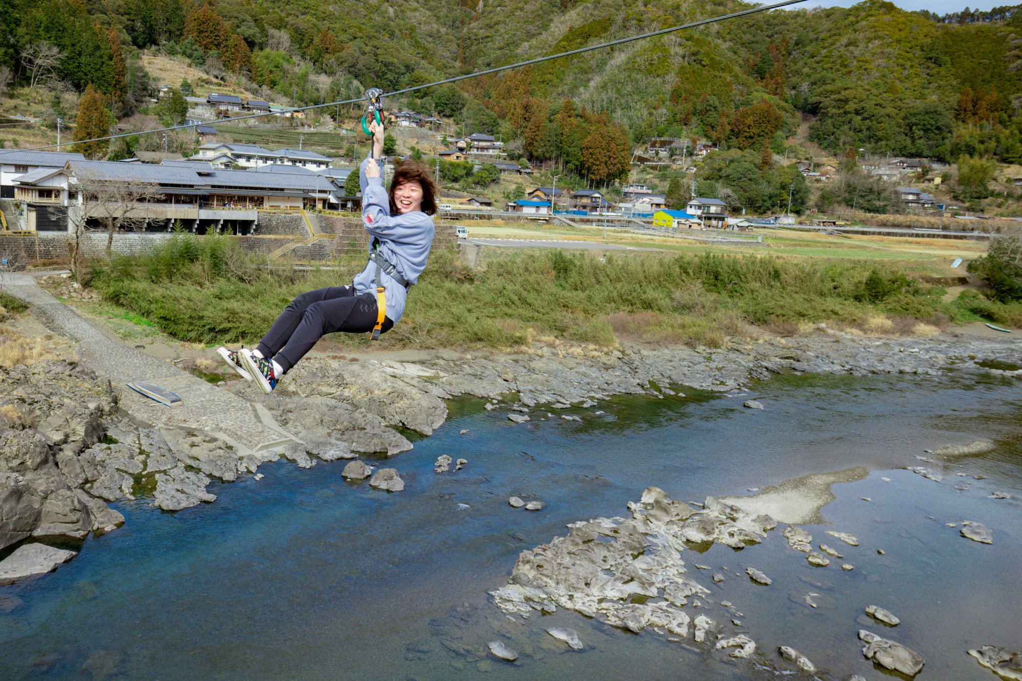 고치역에서 차로 약 2시간, 시만토초의 「미치노에키 시만토와 오와」에 병설되어 있는 「시만토가와 지플라인」에서는, 시만토가와 상공에 건네진 와이어 로프를 푸리라고 불리는 활차를 사용해 미끄러집니다