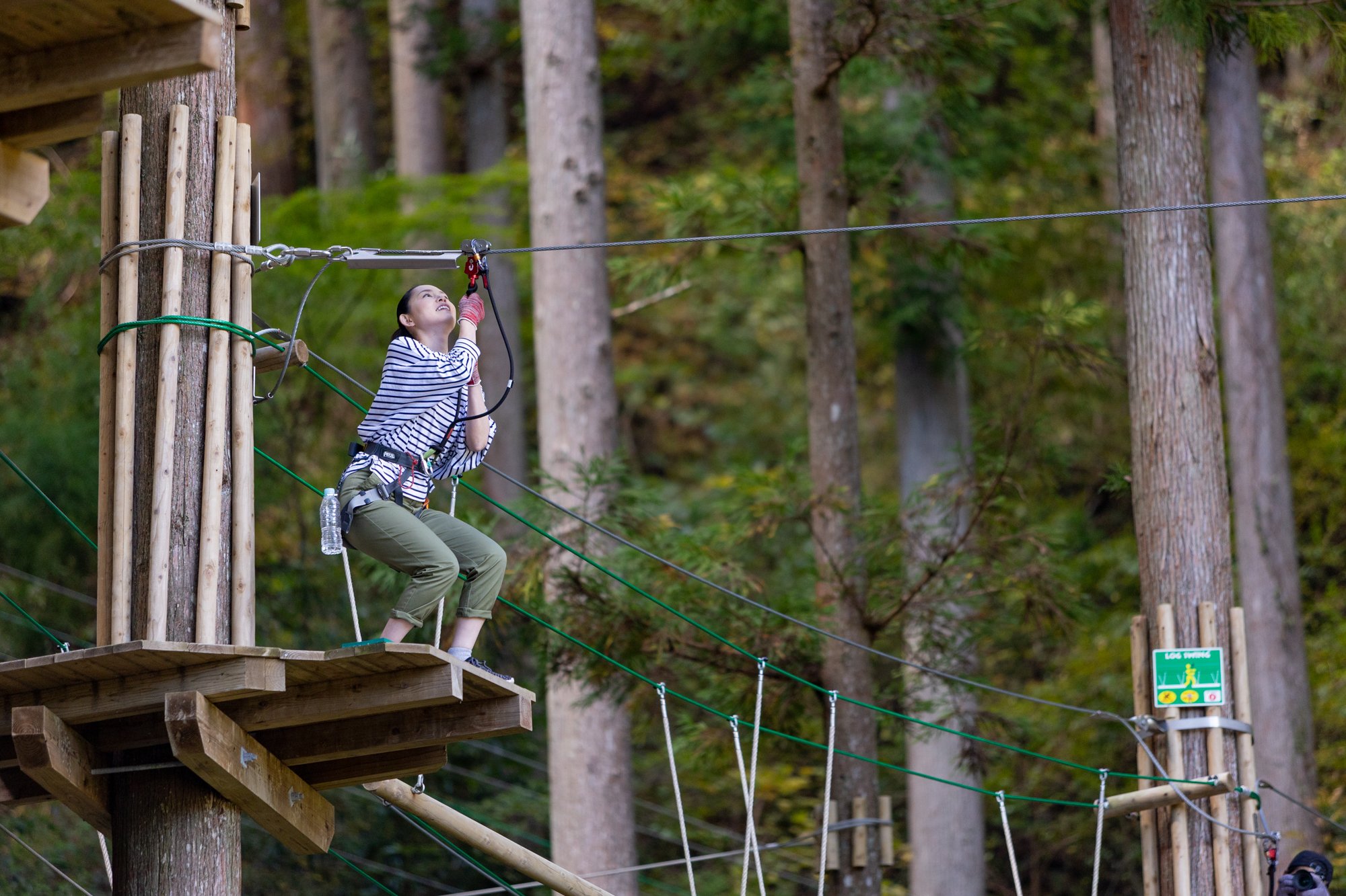 나무에서 나무로 건네진 로프 위를 스스로 이동해 가는 포레스트 어드벤처나무 위에서의 안전은 스스로 조심해야 합니다.코스에 도전하기 전에 안전 기구의 사용 방법을 확인합시다.