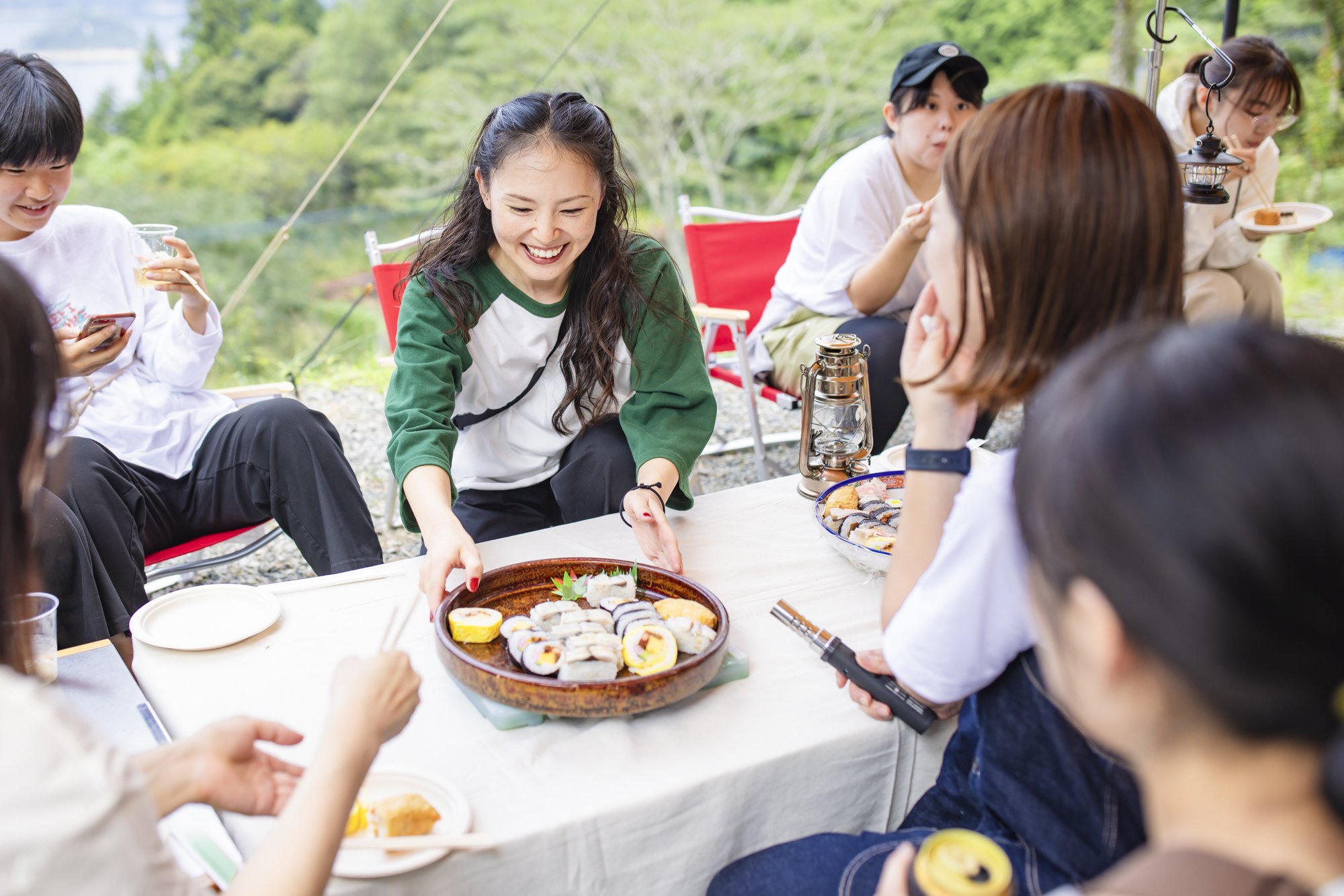 취재반이 방문한 곳은 사메우라 호수를 바라보는 인기의 캠핑장 ‘사메우라 텐트 파크’.이 날은 여성 솔로 캠퍼들의 교류의 장소로서, 에프엠 고치 콜라보레이션 이벤트 「여자 솔로글캔」이 개최되었습니다.