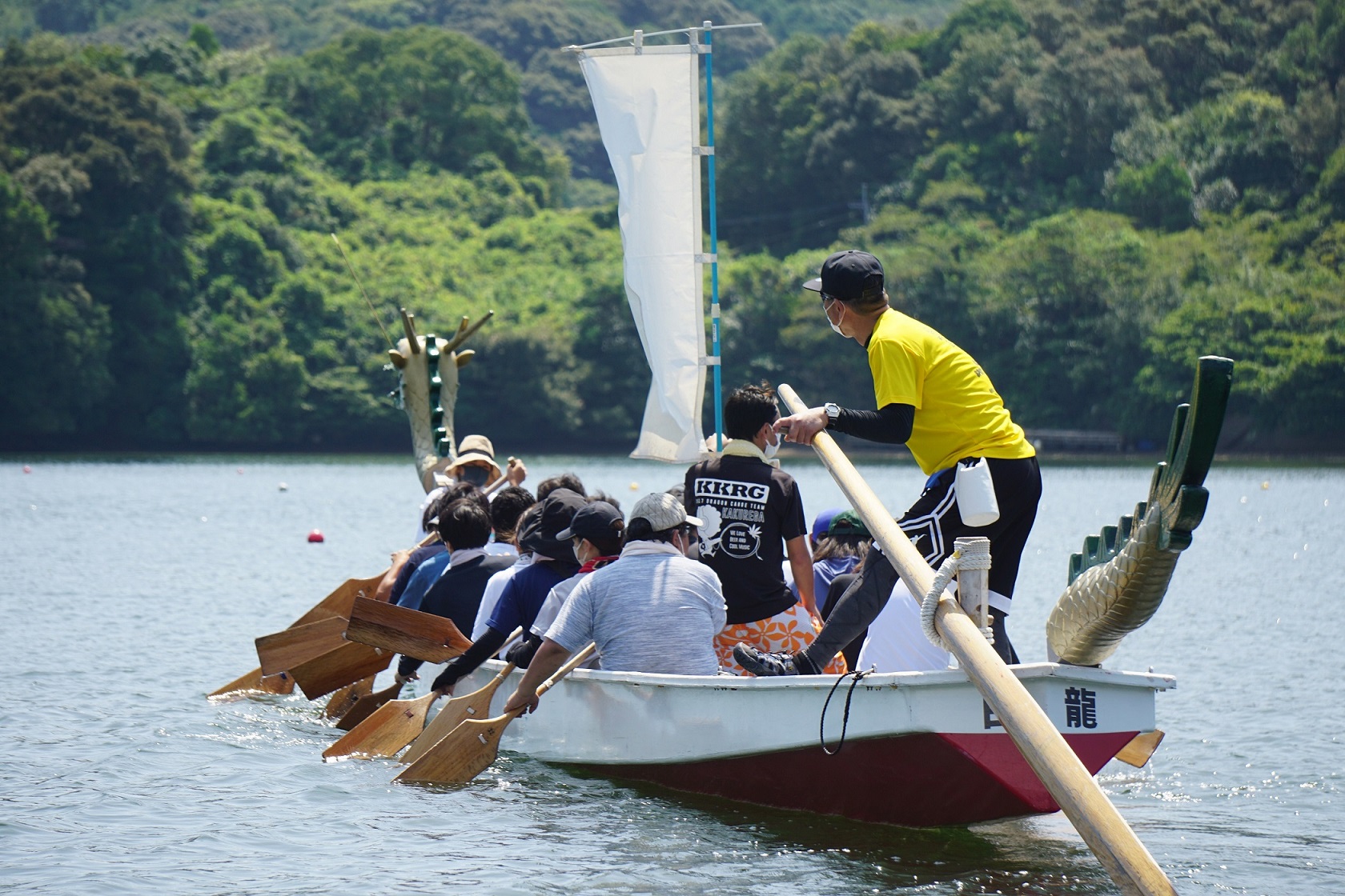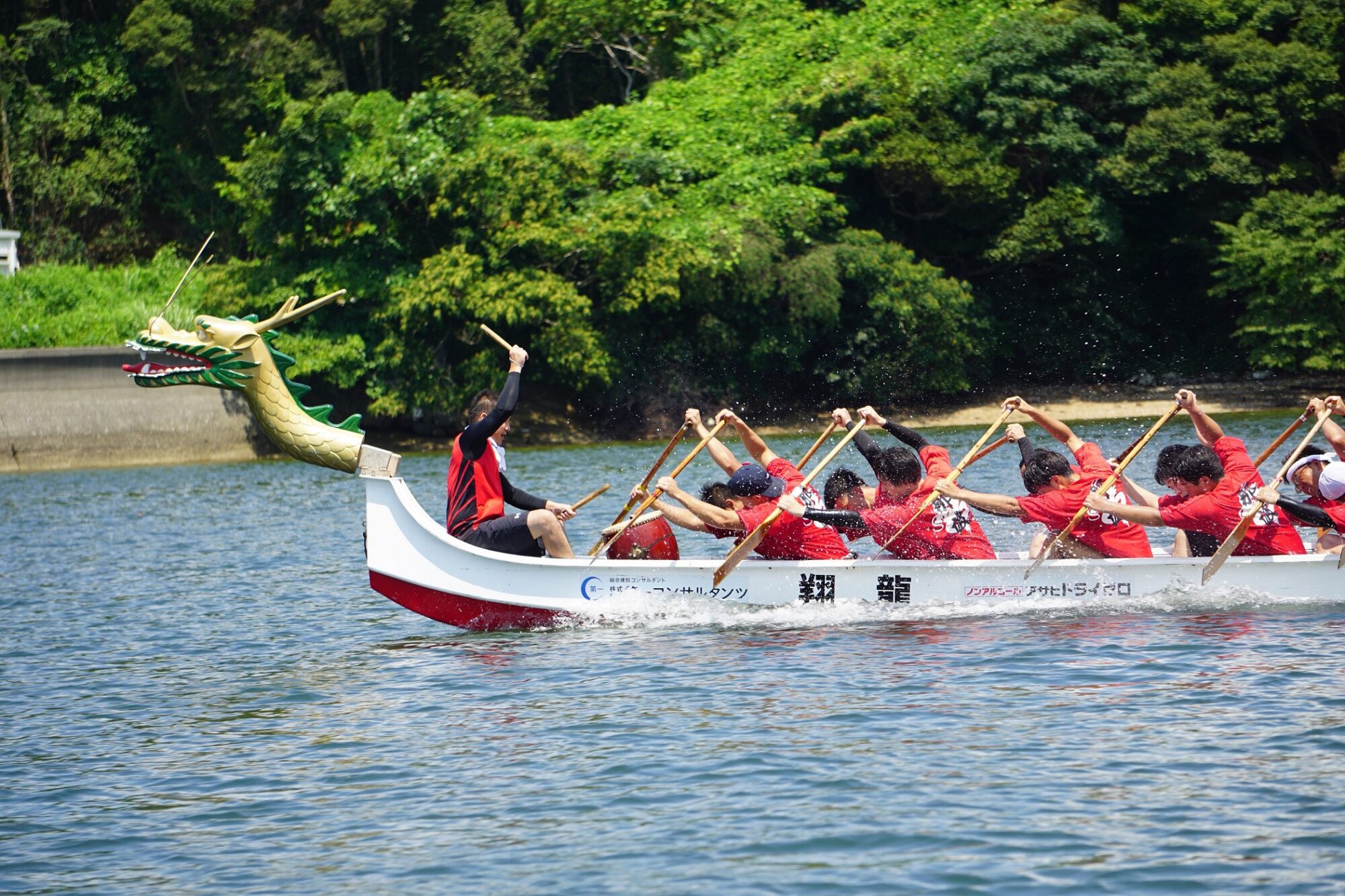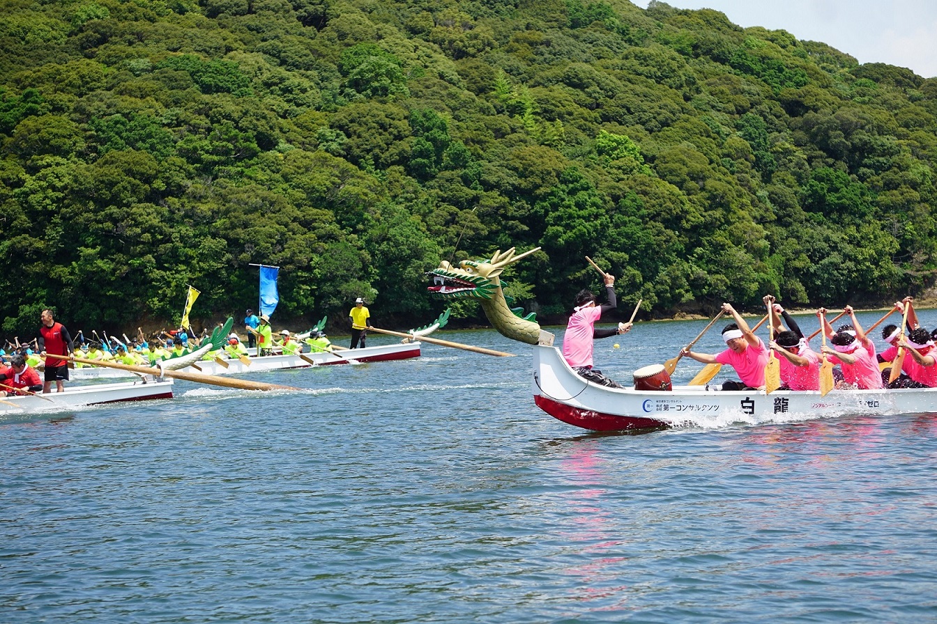 드래곤 카누 대회의 볼거리 중 하나는 출전하는 팀의 특색.직장 동료나 어부의 팀, 현외나 외국인, 이웃의 사람들로 편성된 팀도 있으면, 학생 팀등도 있어, 그 해마다 버라이어티가 풍부한, 십수 팀의 열전을 즐길 수 있습니다.