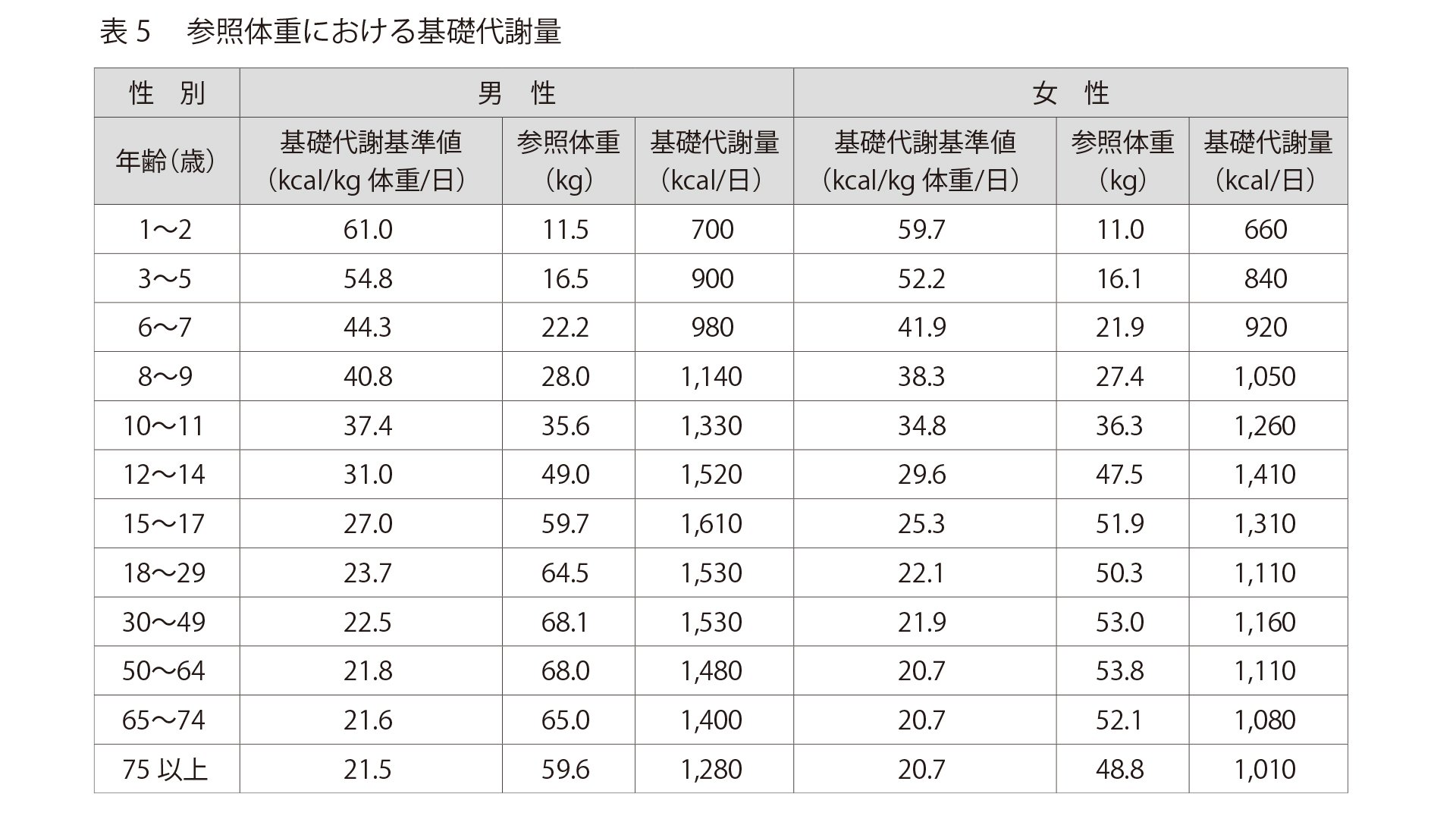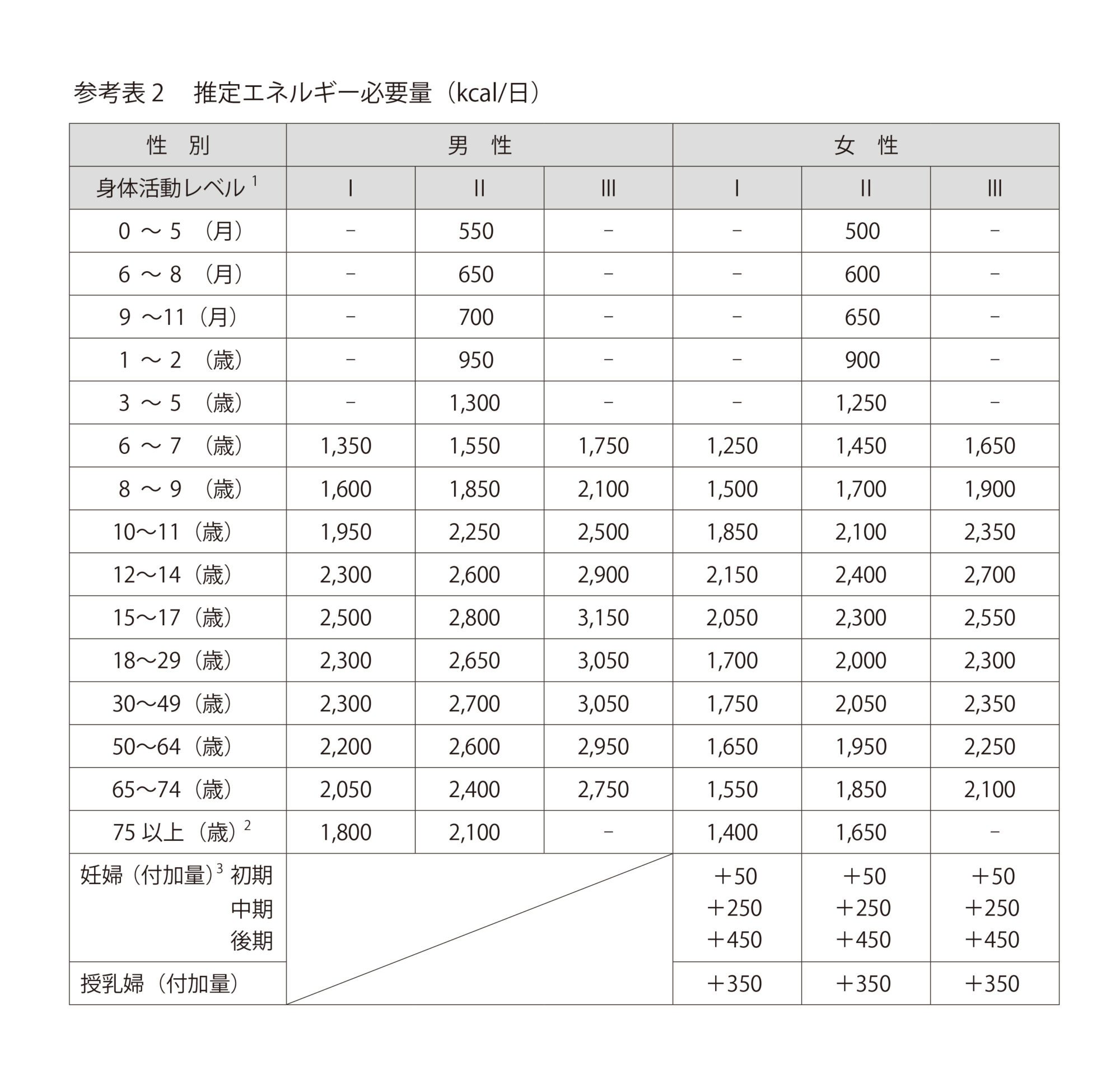 칼로리에는 식사 등에서 섭취하는 「섭취 칼로리」와 신체의 유지나 운동 등으로 소비하는 「소비 칼로리」가 있습니다. 그래서 우선 하루의 생활에 필요한 에너지 양 = 섭취 칼로리를 알아봅시다.아래 표는 후생 노동성의 「일본인의 식사 섭취 기준(2020년판)에서, 1일 당 칼로리 섭취 기준량을 발췌한 것입니다.