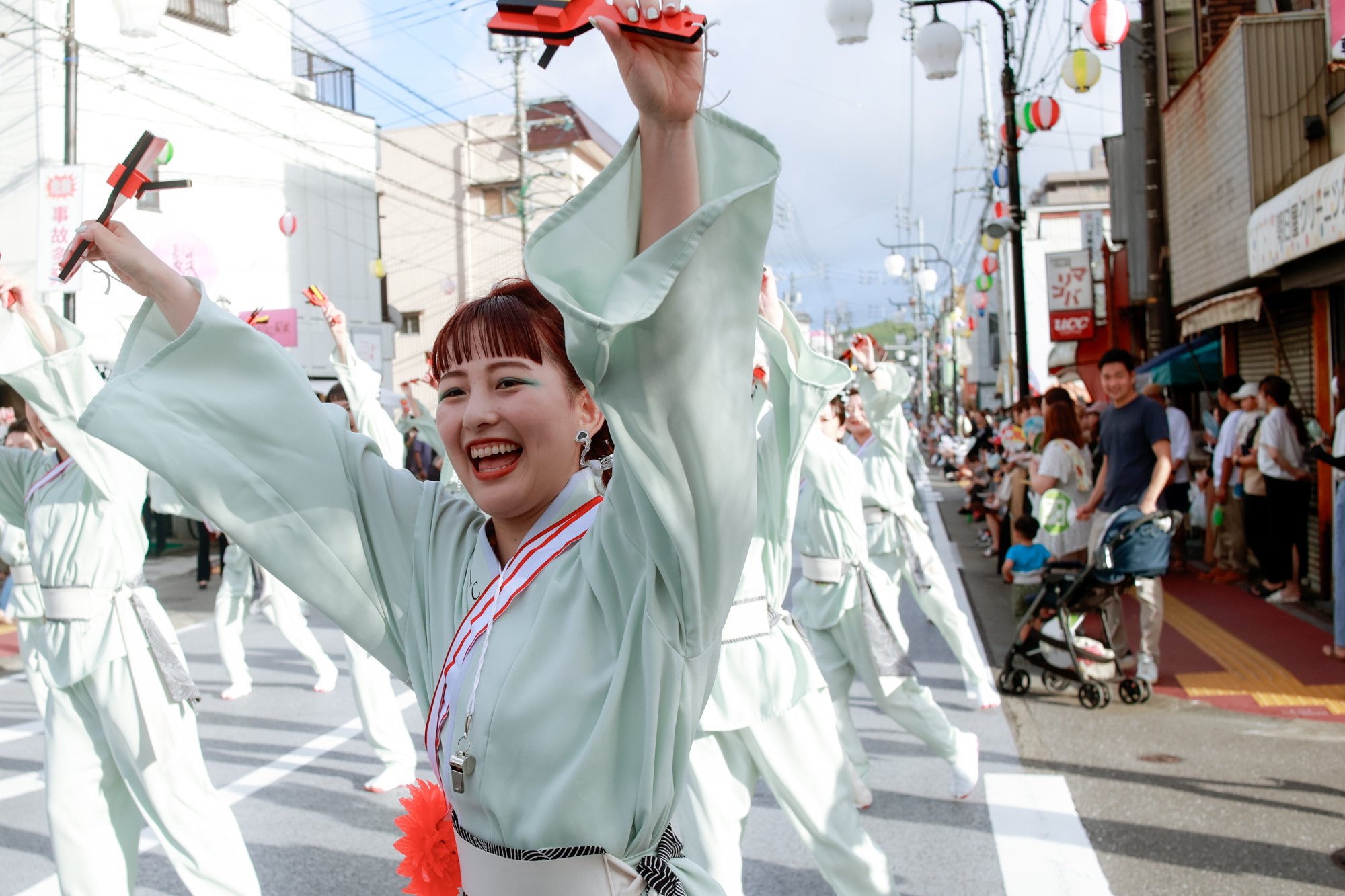 한여름의 땡볕 아래에서 춤추는 춤을 향해 길가의 관람자가 부채에서 바람을 보내면서 응원의 목소리를 거는, 현지에서는 친숙한 응원 스타일입니다.