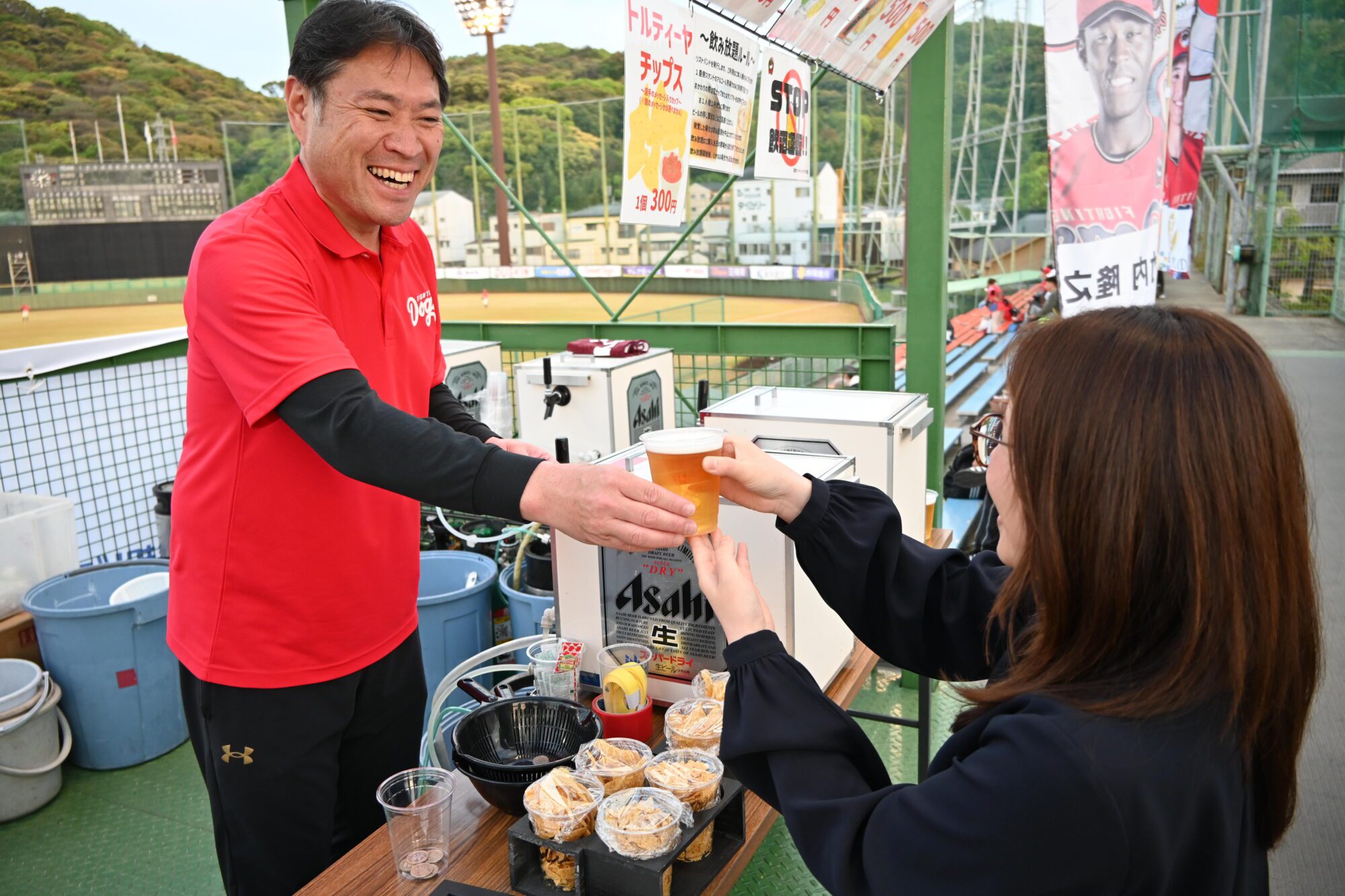 구단 사장인 다케마사씨로부터 맥주를 따라 주셨습니다.