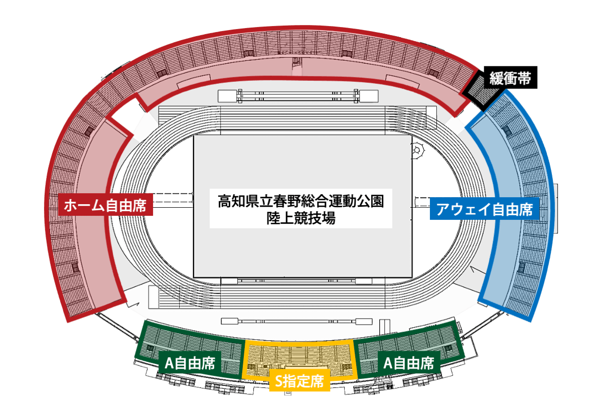열심한 서포터에 의한 걸음이나 북을 사용하는 응원 에리어와, 조용히 볼 수 있는 일반 관전석이 나뉘어져 있으므로, 자신의 스타일로 즐길 수 있습니다.