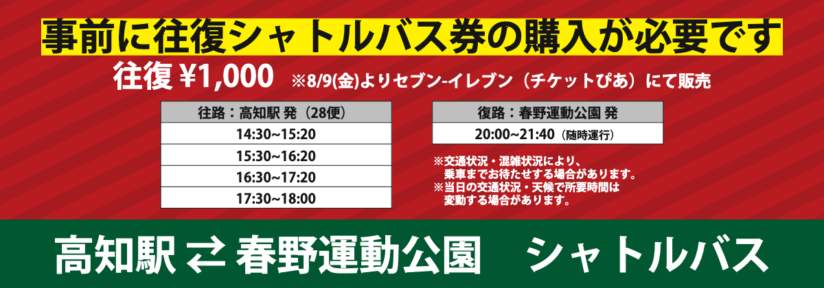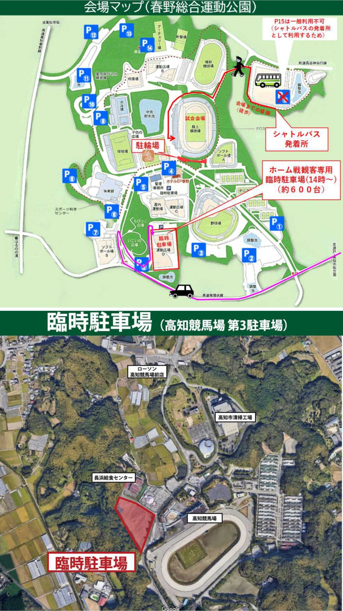 하루노 운동 공원 광장 D(약 600대 이상)의 임시 주차장은 고치 유나이티드 SC의 홈전 전용으로서 14시부터 오픈하므로, 관전자 여러분은, 적극적인 이용을 부탁드립니다.