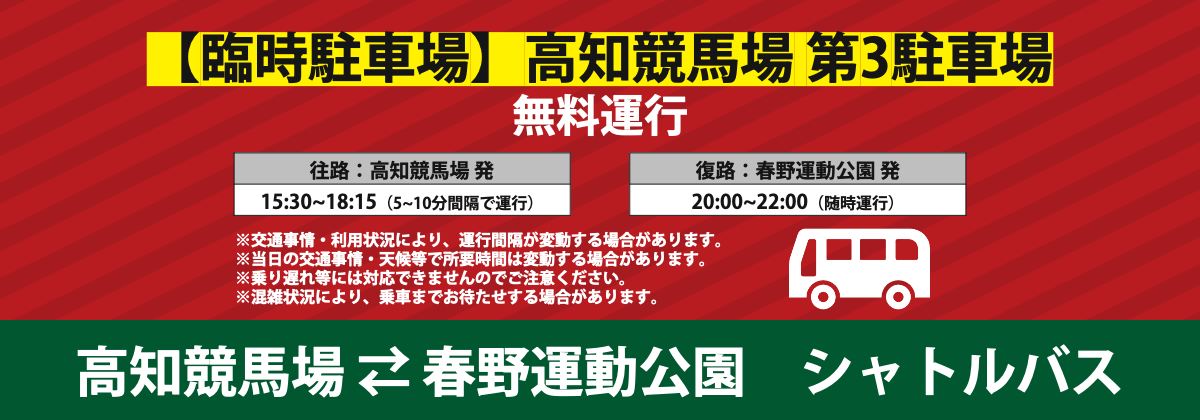 회장의 주차장은 일반 이용자도 있으므로 주차장이 매우 혼잡할 전망입니다.임시 주차장(고치 경마장) 및 셔틀버스(고치 경마장 및 고치역 발착역)의 적극적인 이용을 부탁드립니다.