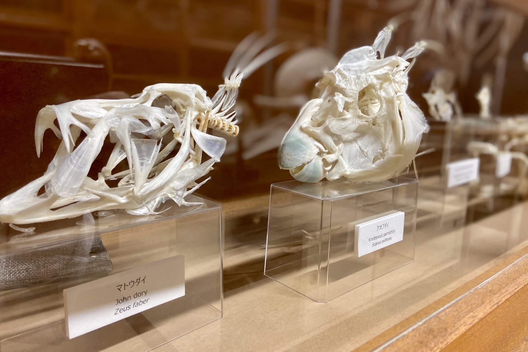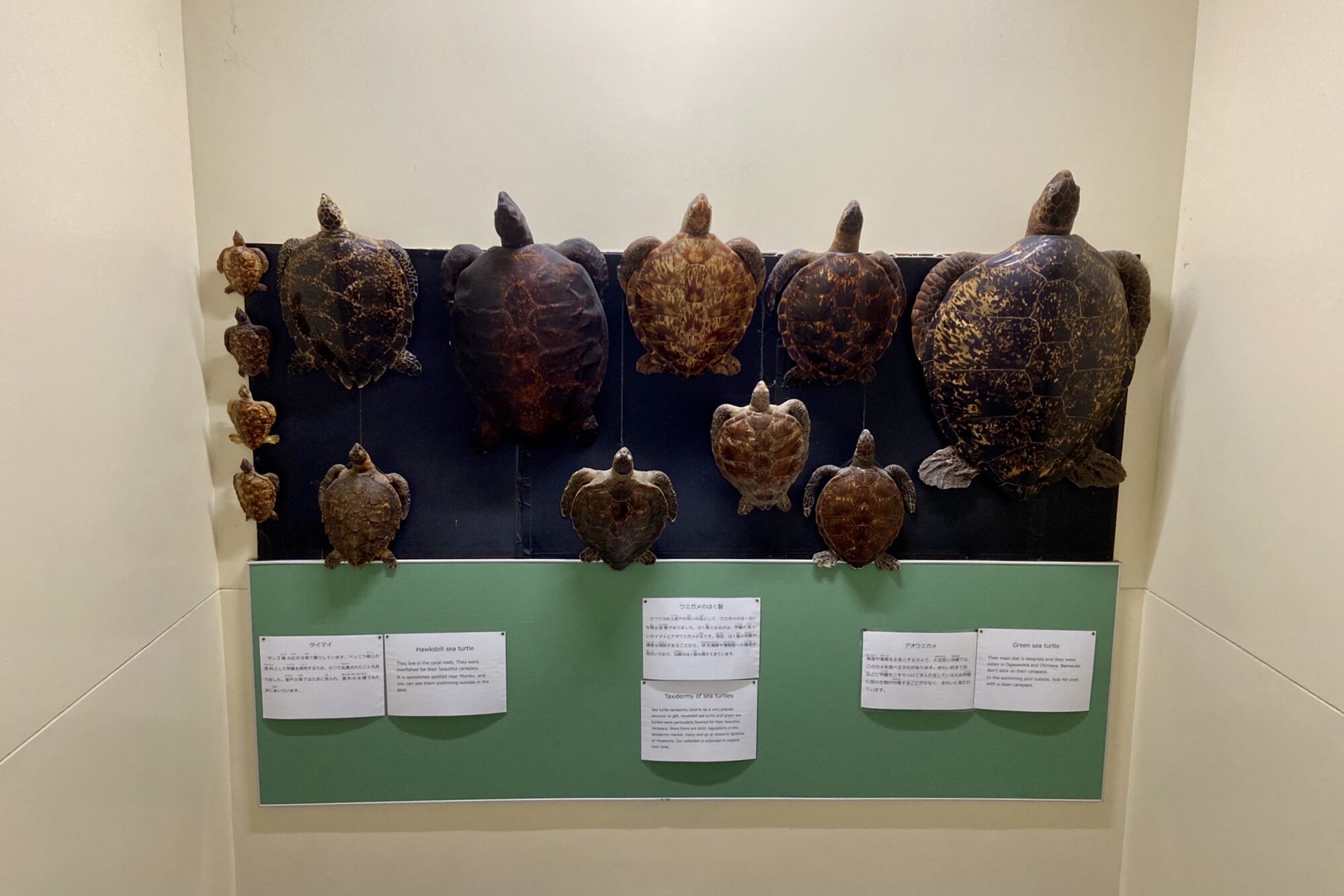 수조 이외에도 순로를 진행해 나가면 나타나는 바다거북의 박제나 큰 고래의 골격 표본 등 아이디어와 센스 넘치는 전시의 「물론 폐교 수족관」.