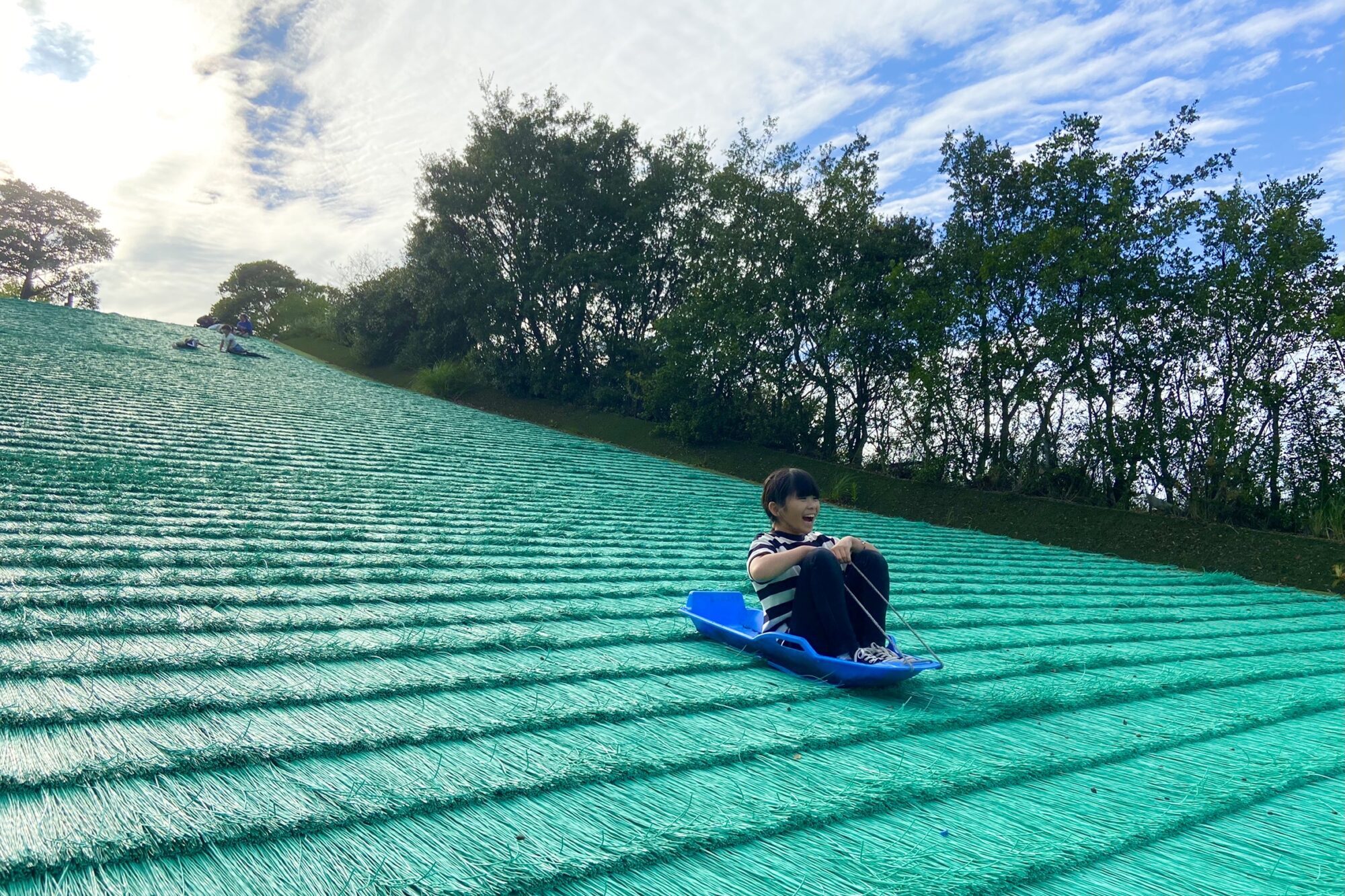 도로를 걸쳐 꼬마 광장의 반대편에는 거리의 긴~이 「잔디 미끄럼 에리어」도비치된 썰매도 놓여 있으므로 빈손으로 놀 수 있습니다. 가로 폭도 넓고 거리도 있으므로 미끄러진 것은 바트군입니다!