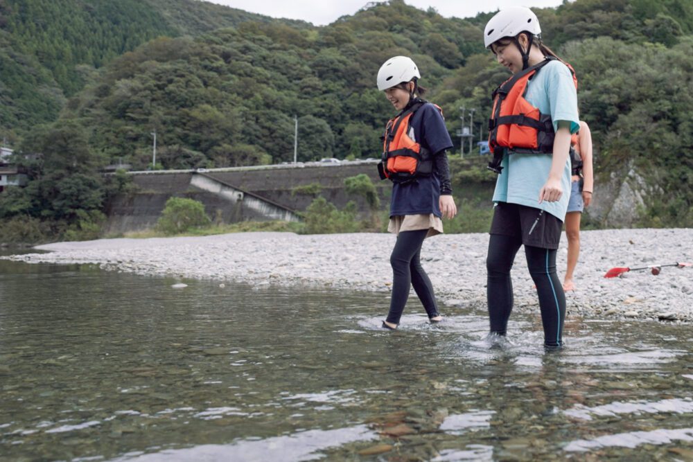 탈의실에서 갈아입을 끝내면 카누에서 강 산책하러 출발합니다. 도보 5분 정도로 가와라에 도착.차창으로 보였던 강이지만 막상 근처에 서면 투명한 수면이 눈앞에 펼쳐져 온화하면서도 웅대한 모습에 순간 발을 멈추고 내려다보게 됩니다.