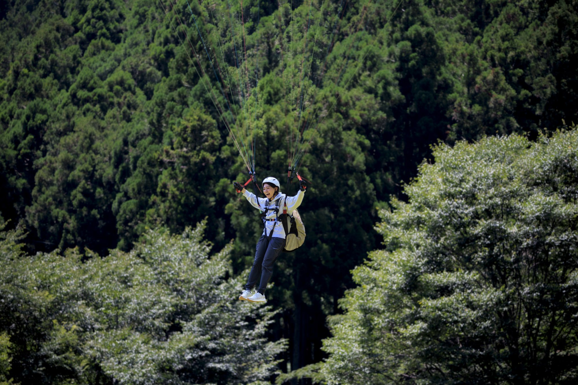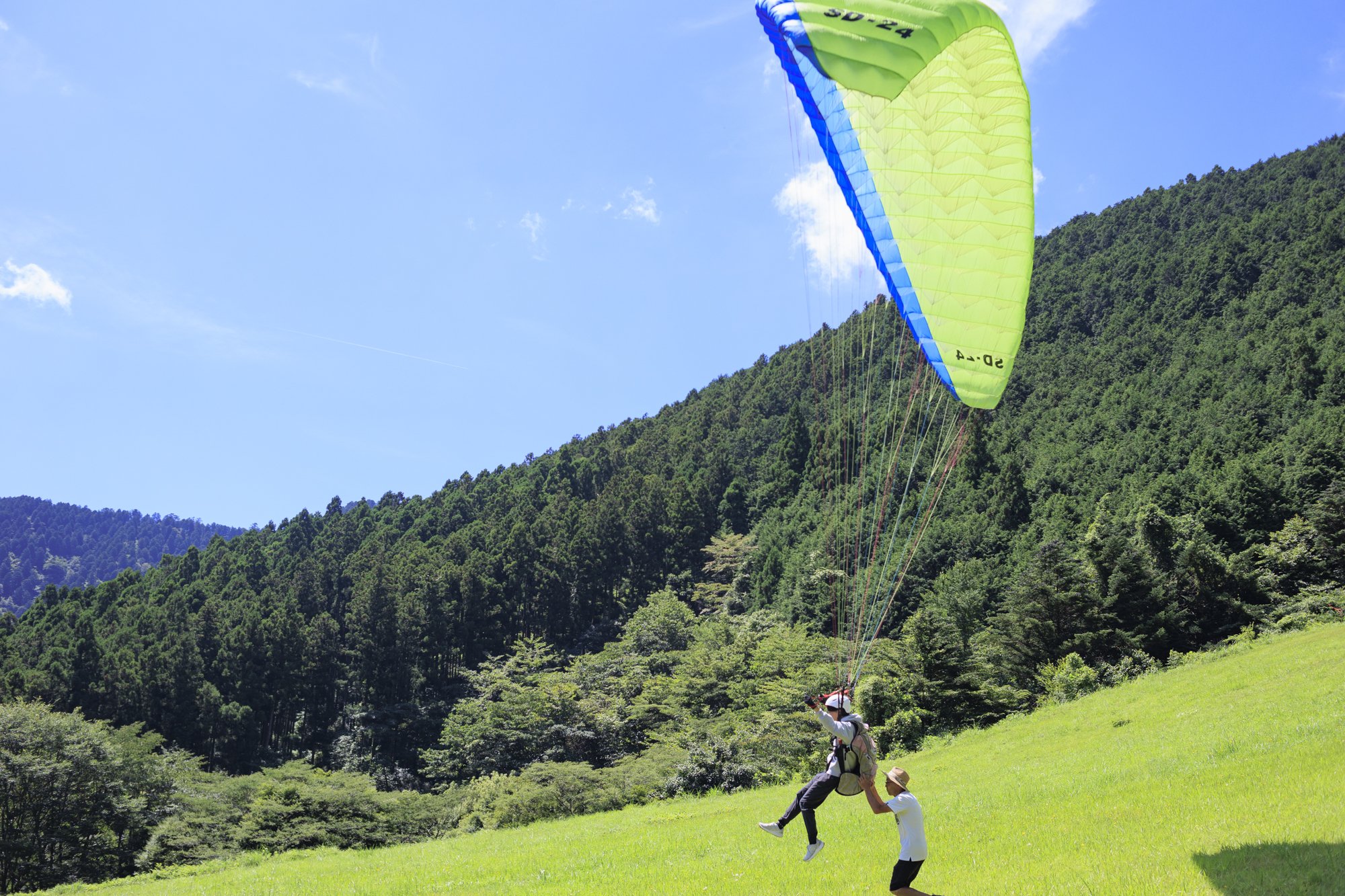 곧바로 지면에서 발이 떨어져 바람을 받아 하늘 높이 날아올랐습니다.시야에 뛰어들어 오는 주위의 초록과 온몸으로 느끼는 바람패러글라이더는 동력을 사용하지 않고 자연의 바람만을 이용하고 있기 때문에 불필요한 소리는 일절 들리지 않습니다.활공은 천천히 하늘과 바람과 산과 일체가 되는 감각을 맛볼 수 있습니다.이것이 바로 새가 된 기분!패러글라이더 특유의 상쾌감에 감동입니다.