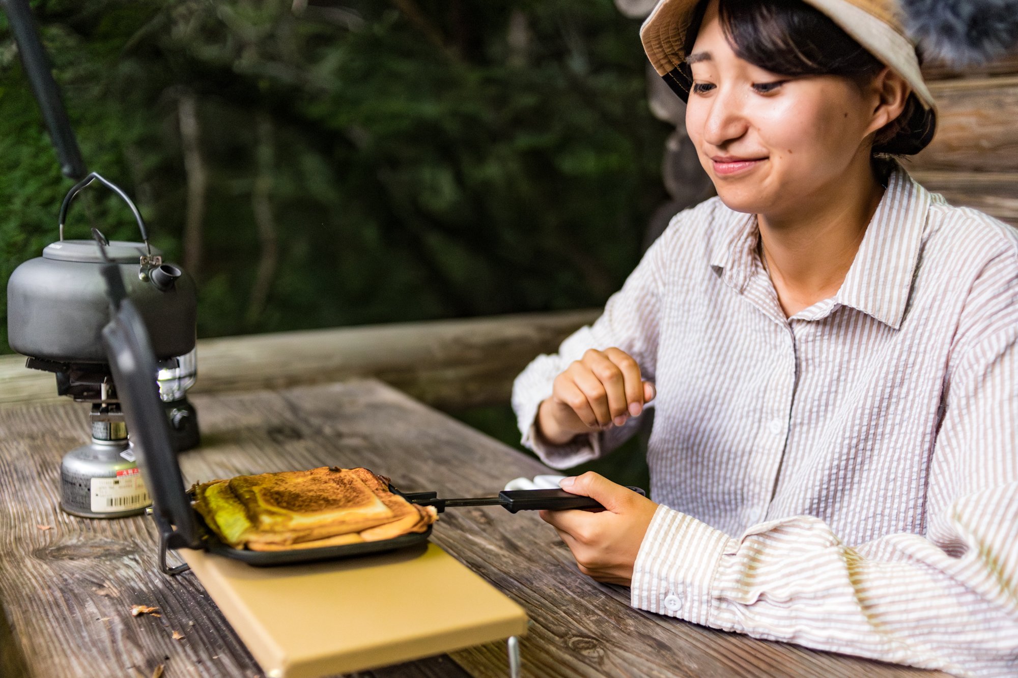 저녁밥은 지참한 식빵으로 핫 샌드 만들기맑은 공기의 테라스에서 먹는 맛은 특별합니다.한 입에 맛이 퍼져, 행복감으로 채워집니다.