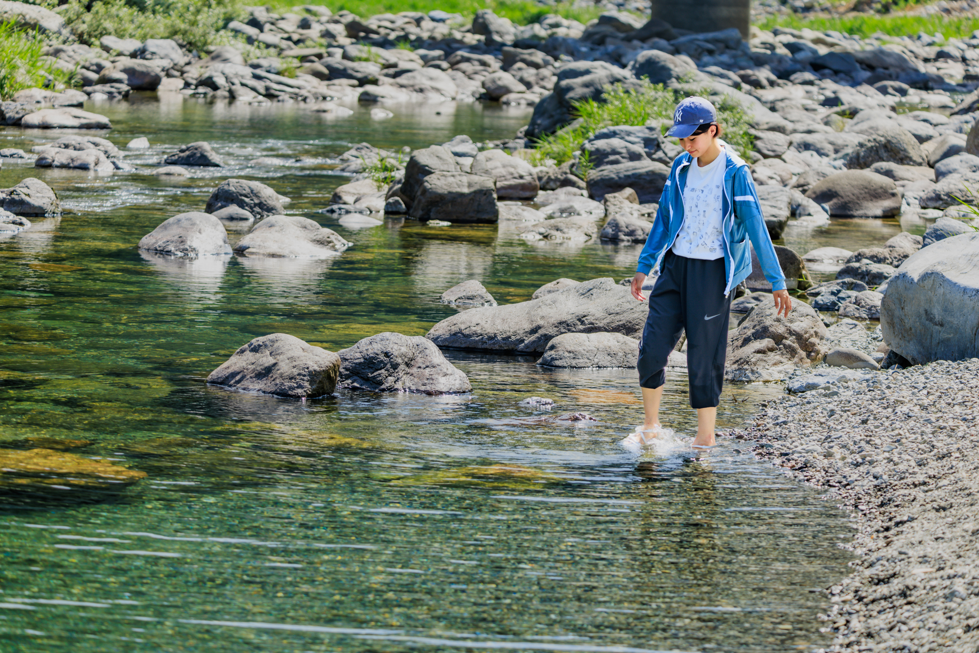고호쿠 무사비 온천 바로 옆을 흐르는 가미하치카와 강에는 주차장 옆의 코지를 통해서 가와라까지 내려가는 것이 가능합니다.온화한 흐름으로 사람도 적기 때문에 혼자 여행으로 조용히 시원한 장소입니다.