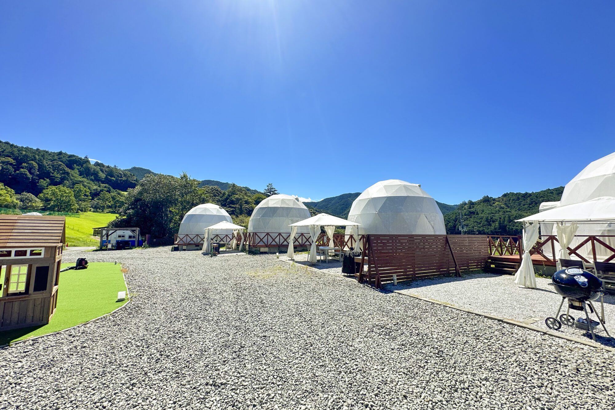 두 사람이 묵는 것은 '스카이힐 골프 클럽'에 병설된 '스카이힐그램핑~4만십의 별하늘~'.이곳에는 돔 텐트, 트레일러 하우스 및 오토 사이트의 3 구역이 있습니다.이번에 2명이 예약한 것은 사치스러운 리조트 기분을 맛보는 돔 텐트입니다.