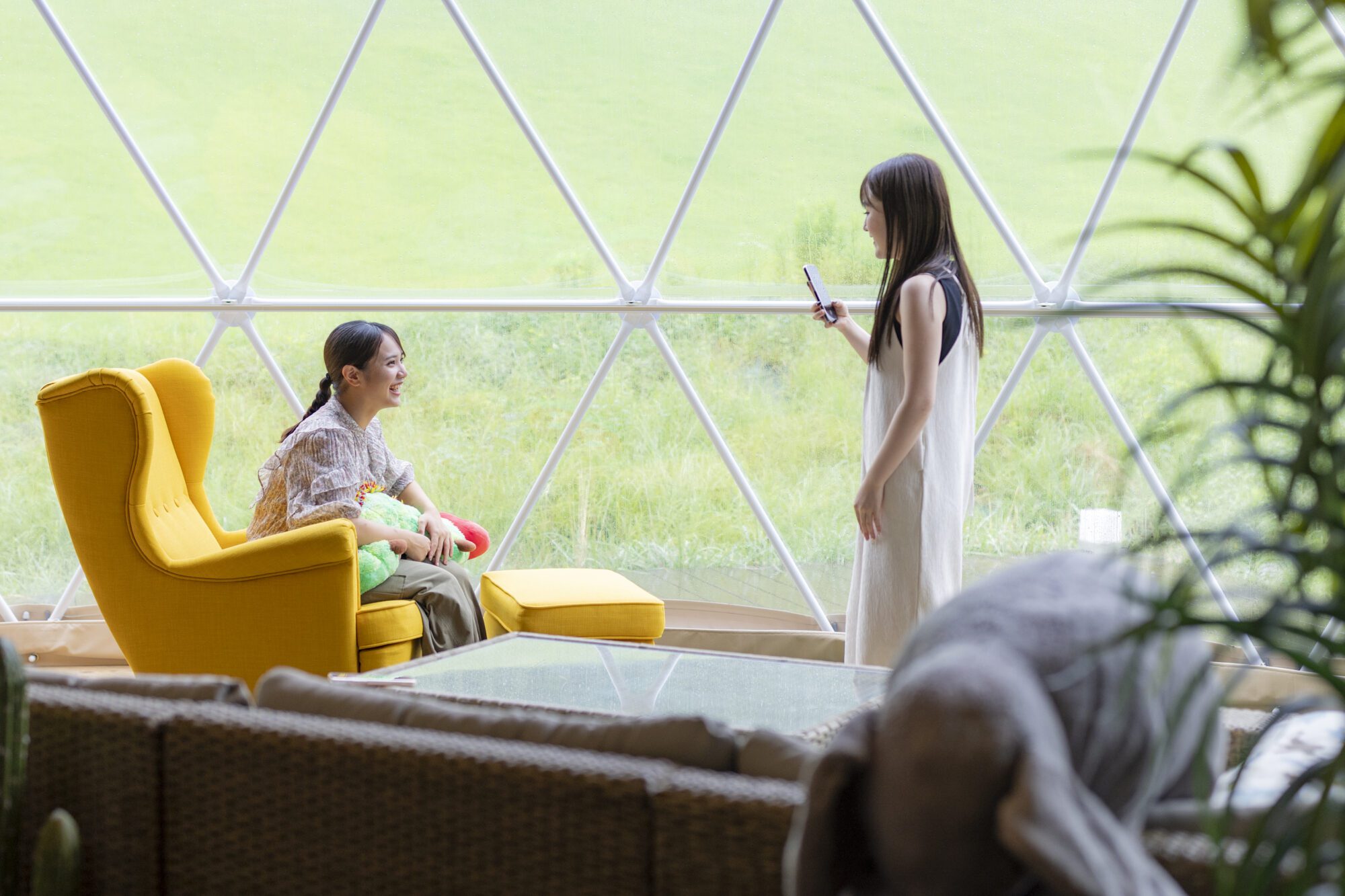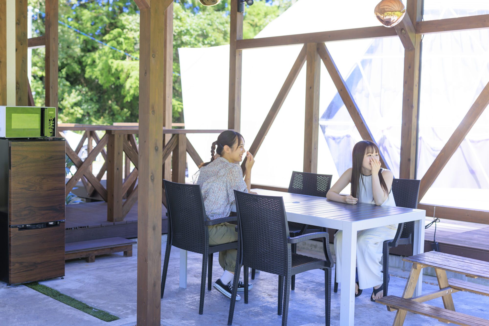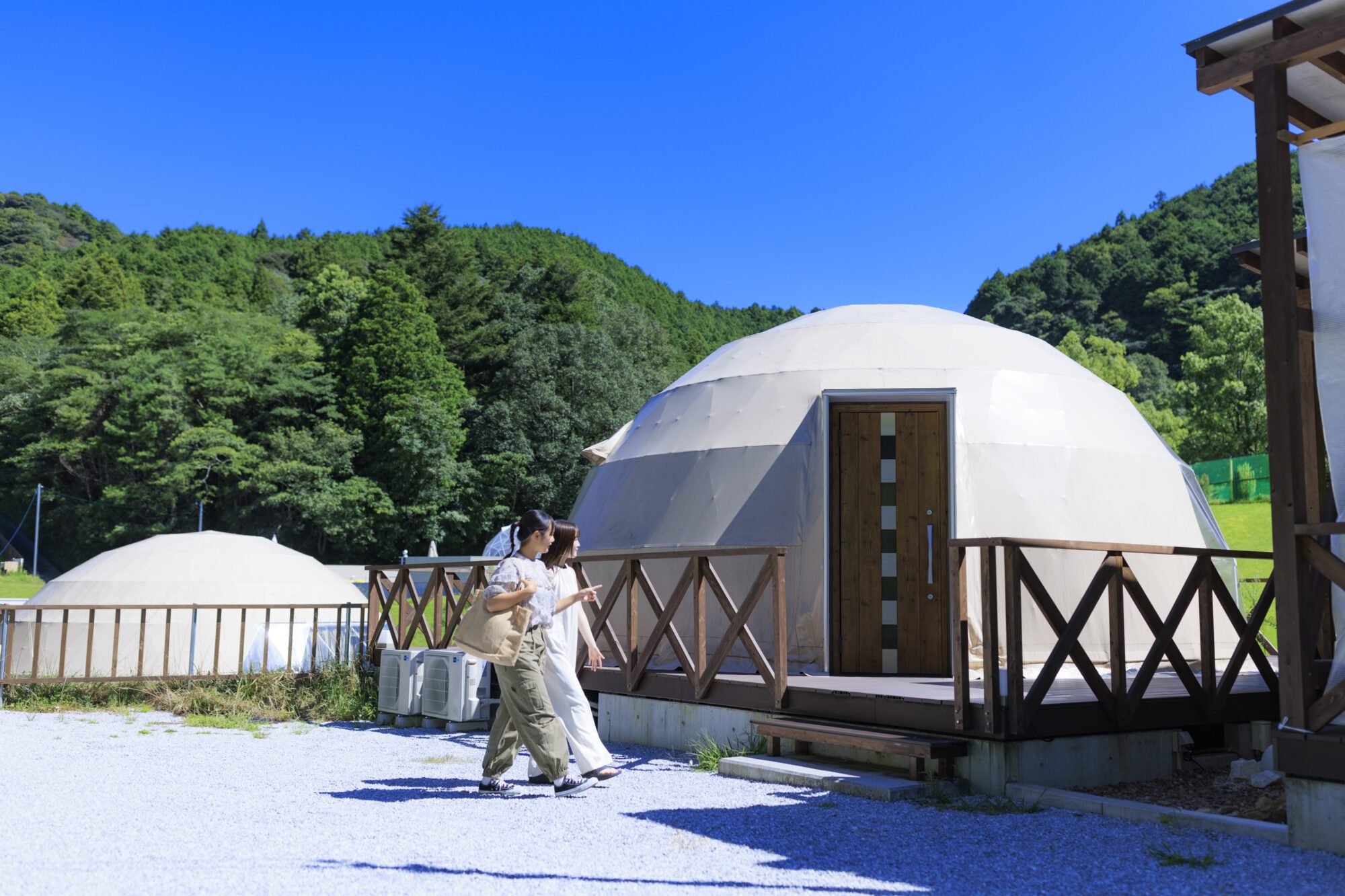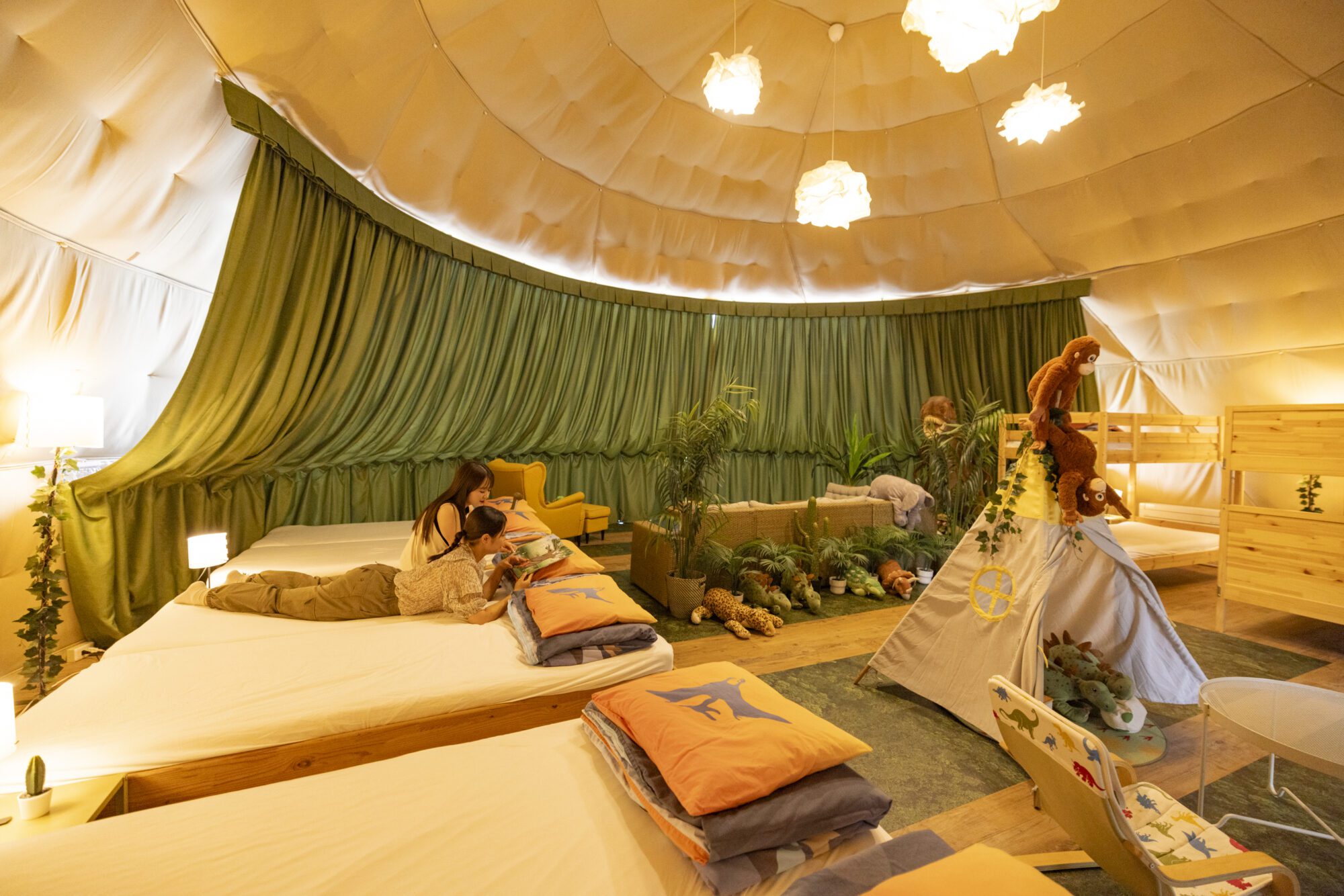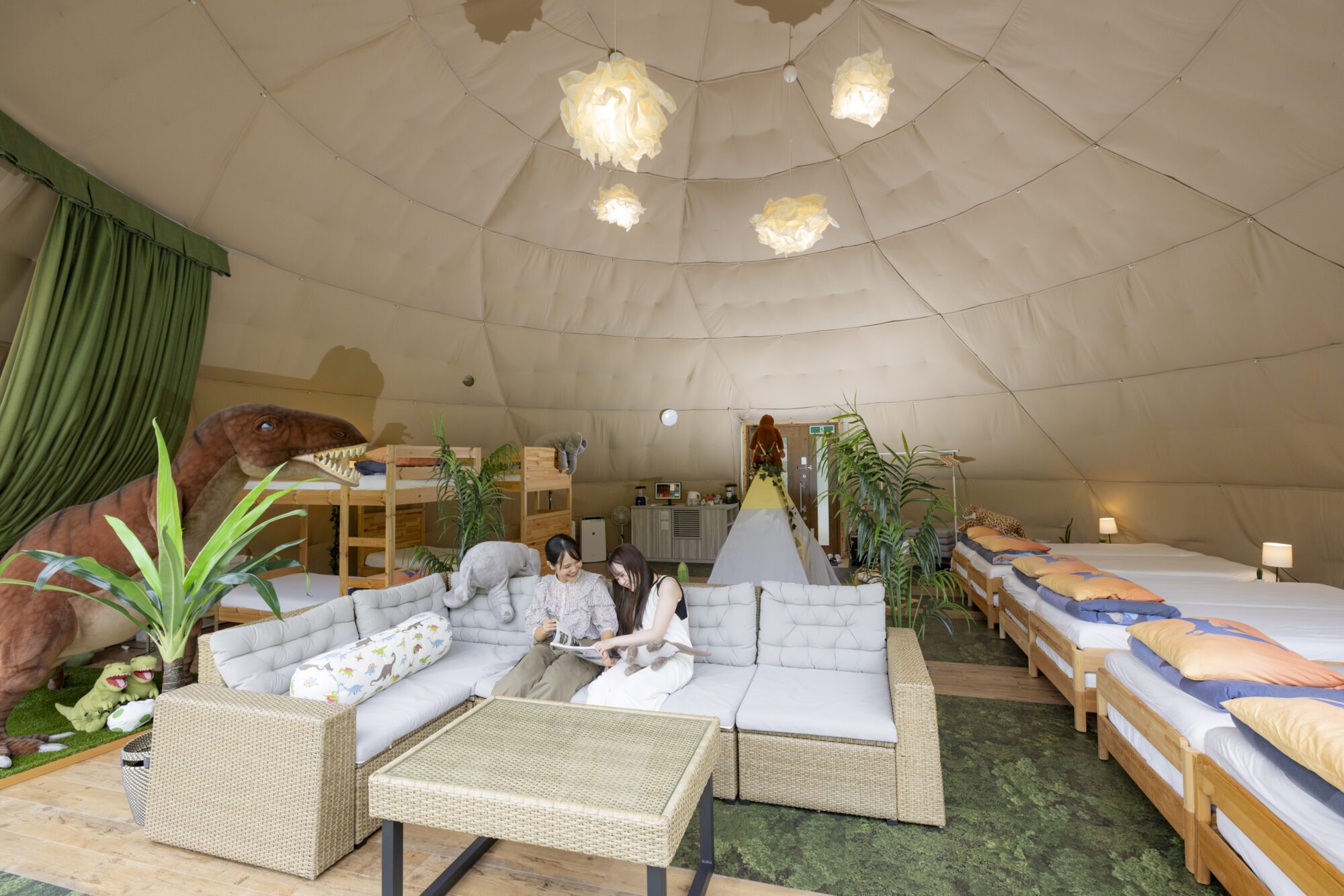 넓은 노천탕 부착 10m 텐트 "Dinosaur"에 도착.귀여운 인테리어에 텐션이 오르는 2명!리조트 기분이 가득한 실내에서 기념 촬영하거나 느긋하게 잡지를 읽거나 휴식을 취하고 드라이브의 피로를 치유하세요