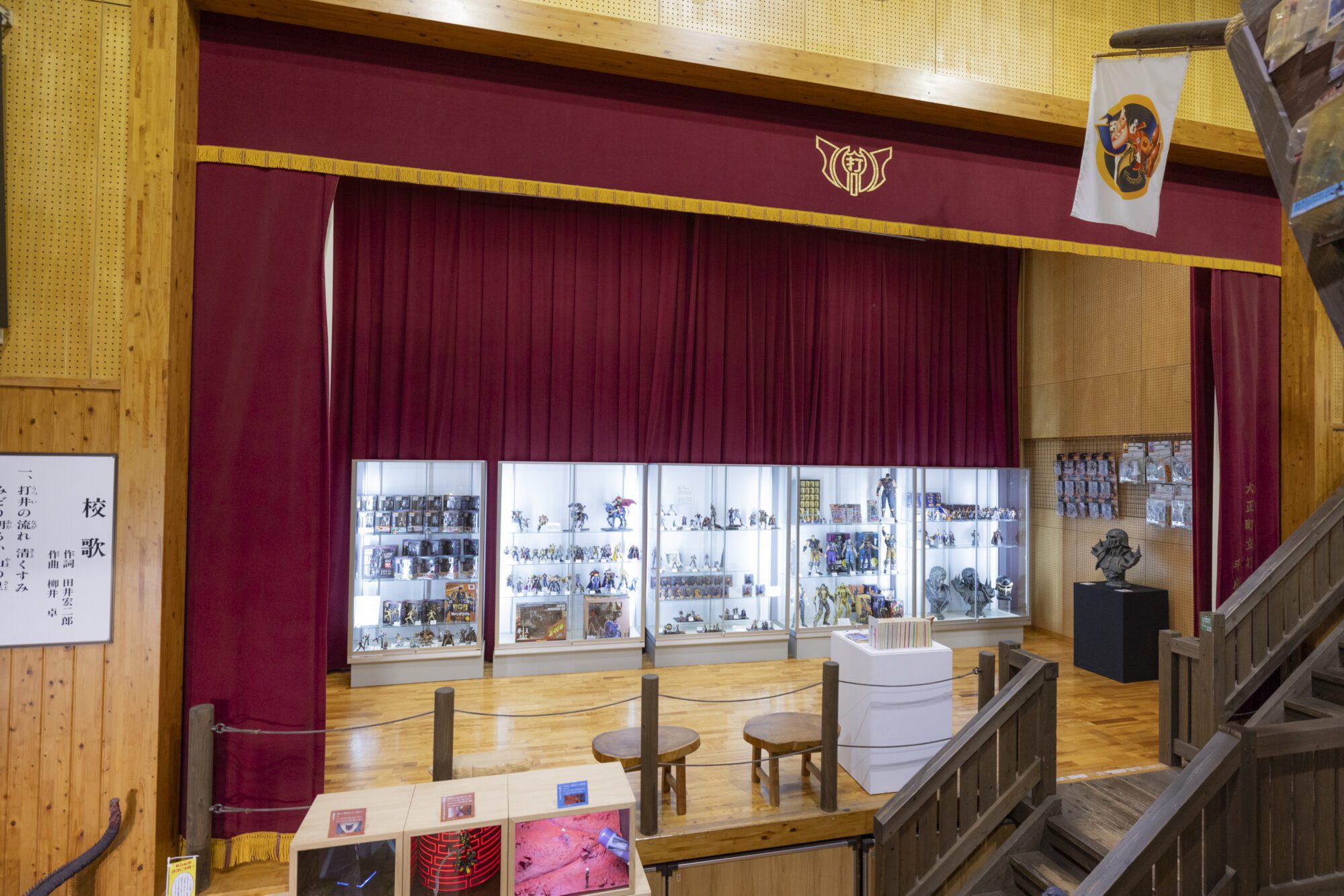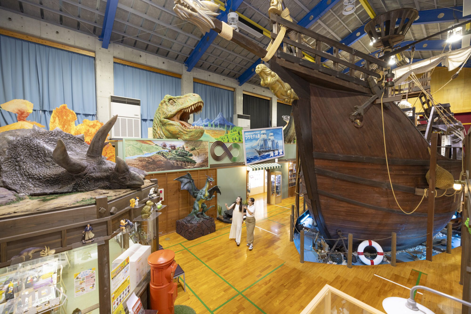 관내에는 체육관의 바닥이나 연대, 커튼 등이 그대로 남아 있습니다.조금 노스탤직한 체육관을 이렇게 소중히 활용하고 있는 것도, 해양당 호비관 시만십이라면중앙의 바닥을 뽑아 놓은 큰 카탈로니아선(여기도 전시 공간!)야, 시선보다 높은 장소에 놓인 큰 공룡의 피규어 등 장난기 가득한 연출도 즐거움의 하나입니다.
