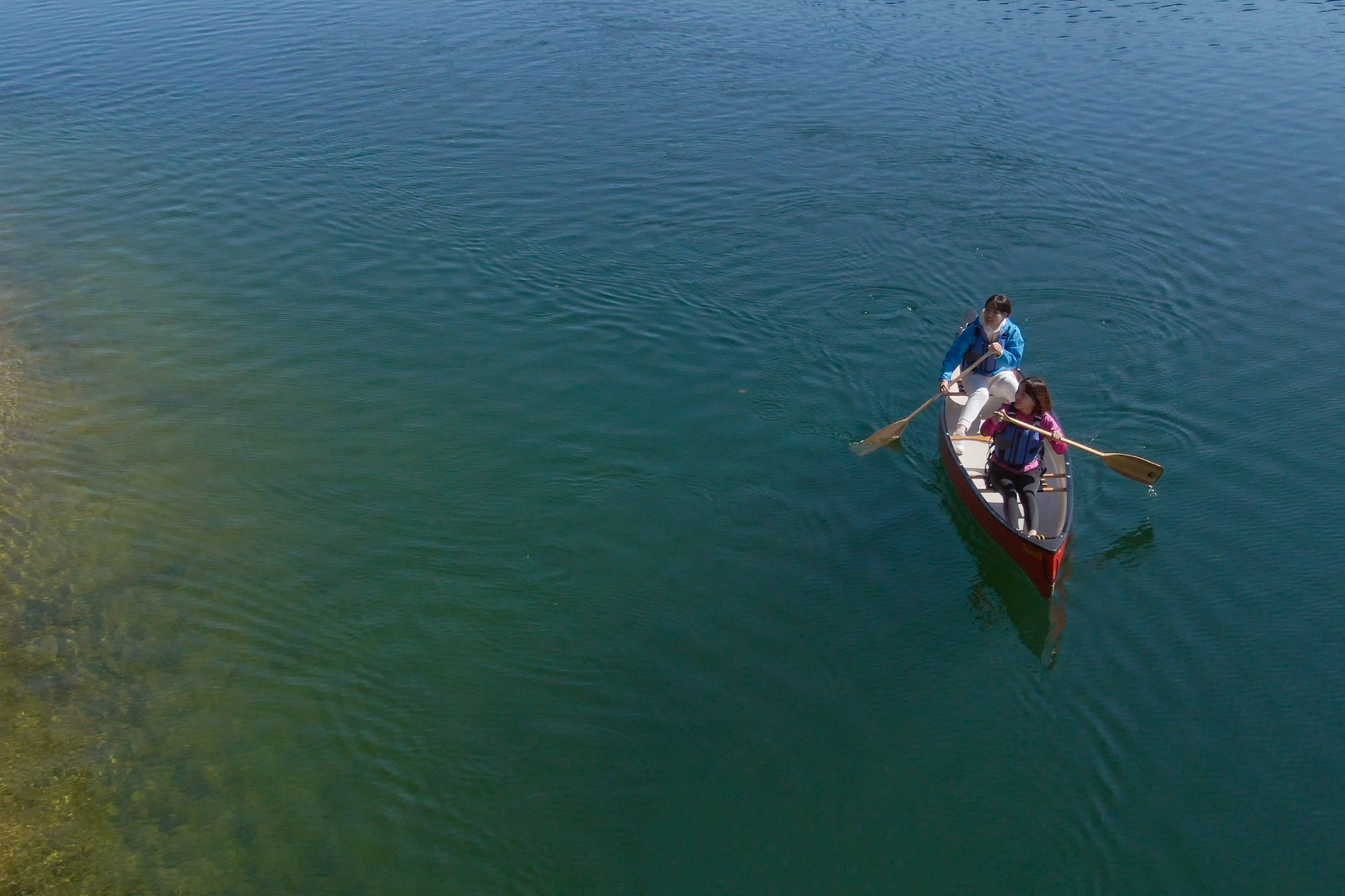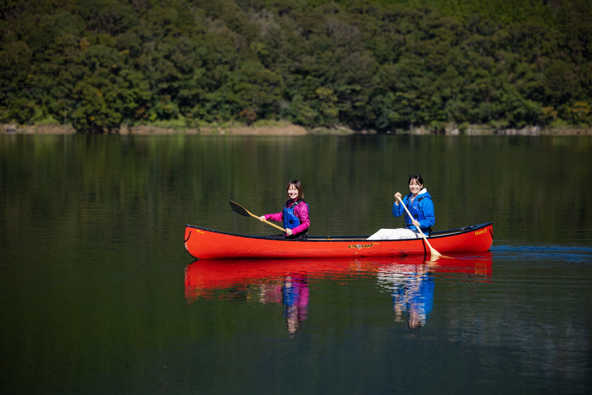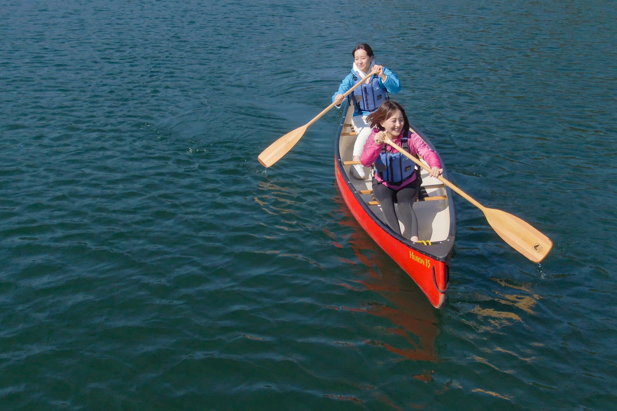 오픈 데크의 넓은 배를, 한쪽에만 블레이드(물을 파악하는 부분)이 붙은 싱글 패들을 사용해 느긋하게 젓는 「캐나디안 카누」