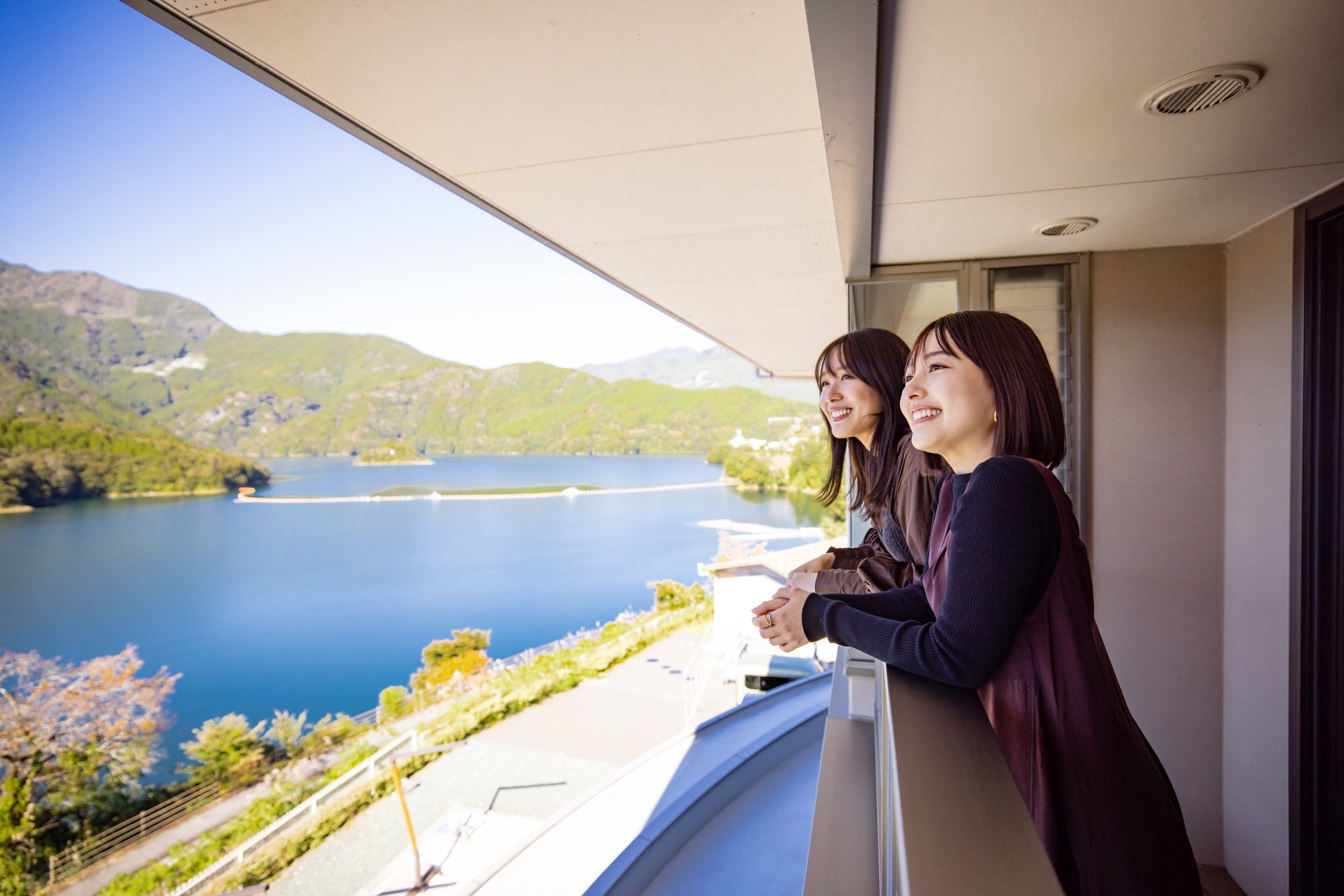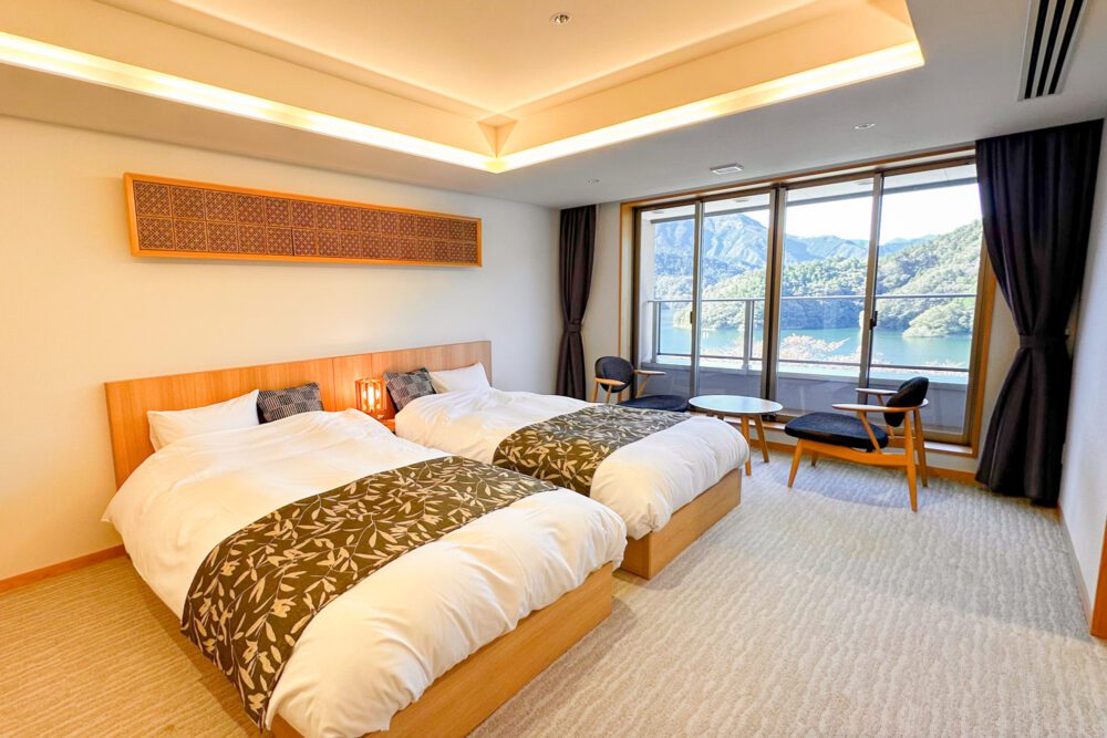고치현 미네호쿠산의 목재를 사용한 나무의 향기 감도는 이 호텔의 매력은 뭐니뭐니해도 전실 레이크뷰의 게스트 룸.그 중에서도 추천하는 것이 디럭스 트윈과 일본식 뷰 욕실에서, 창문에서 호수의 경치를 즐기면서 목욕할 수 있습니다.