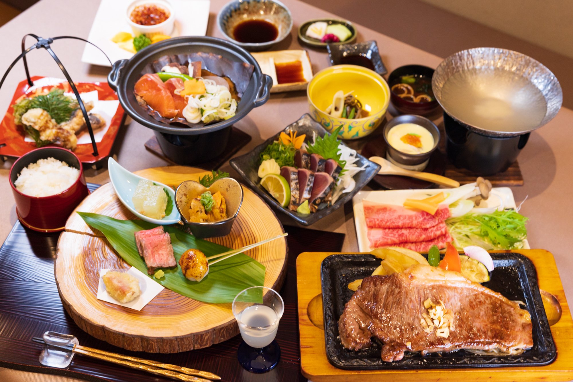 숙박 이외의 손님도 이용할 수 있는 레스토랑에서는 도사 아카우시를 사용한 로스트 비프 등의 단품 요리도 주문 가능코스 요리뿐만 아니라 지산의 소재를 살린 향토 요리 등의 일본요 아라카르트도 제공하고 있습니다.