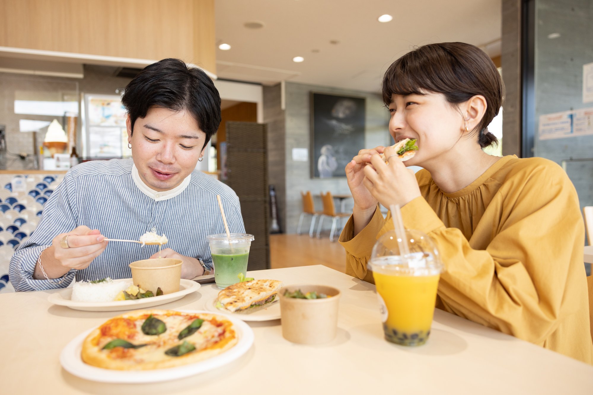 충분히 바다의 세계를 즐긴 후에는 관내의 카페에서 휴식.커피나 타피오카 망고 등의 음료, 카레나 마르게리타 등의 가벼운 식사도 있습니다.오션뷰 경치를 즐기면서 천천히 보내 보세요.