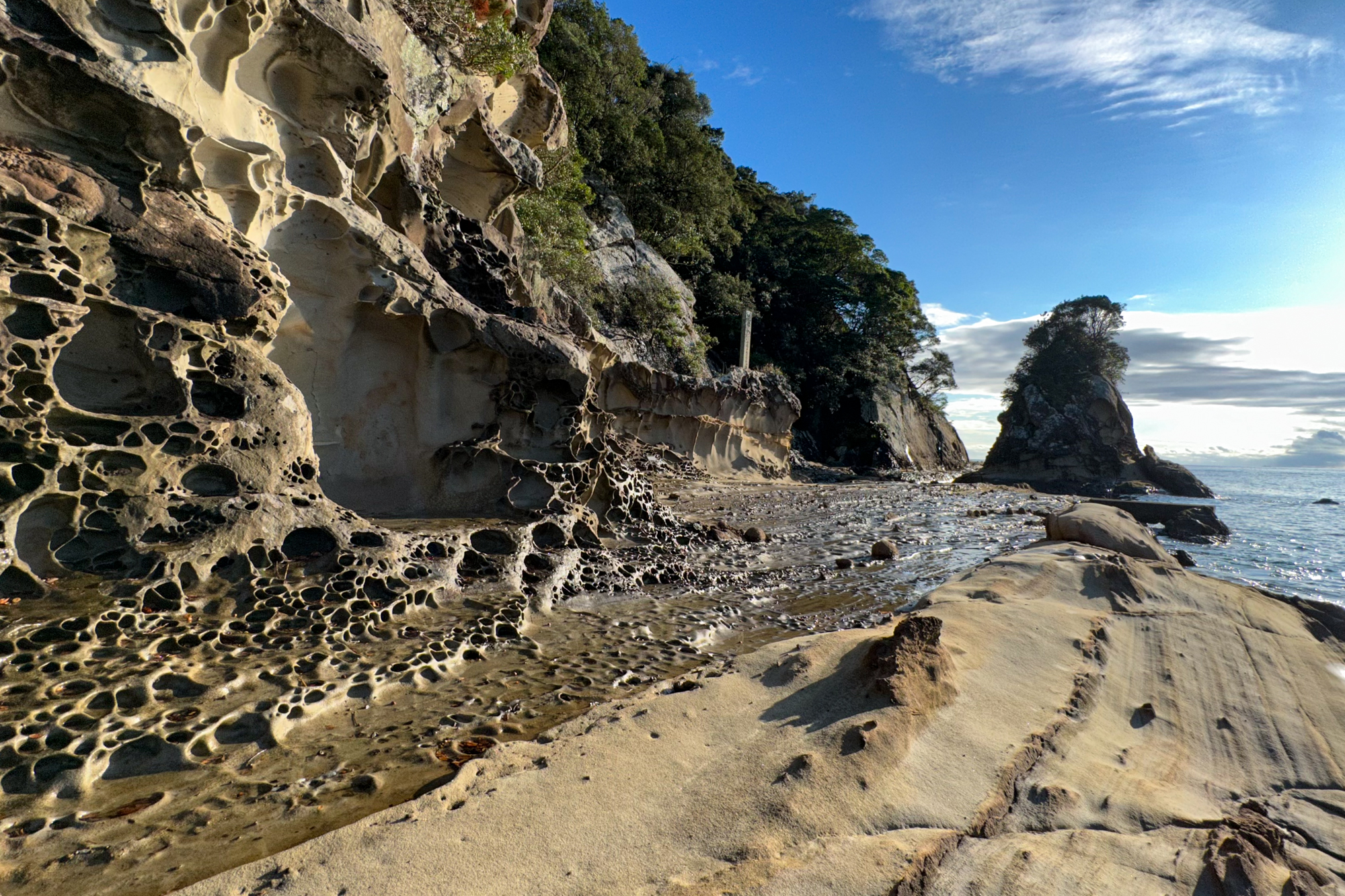 눈앞에 펼쳐지는 사생활감이 가득한 해변에서는 파식이나 풍식에 의해 형성된 도사시미즈 특유의 기암을 가까이서 볼 수 있으므로 자연의 아트를 관찰하는 것도 추천