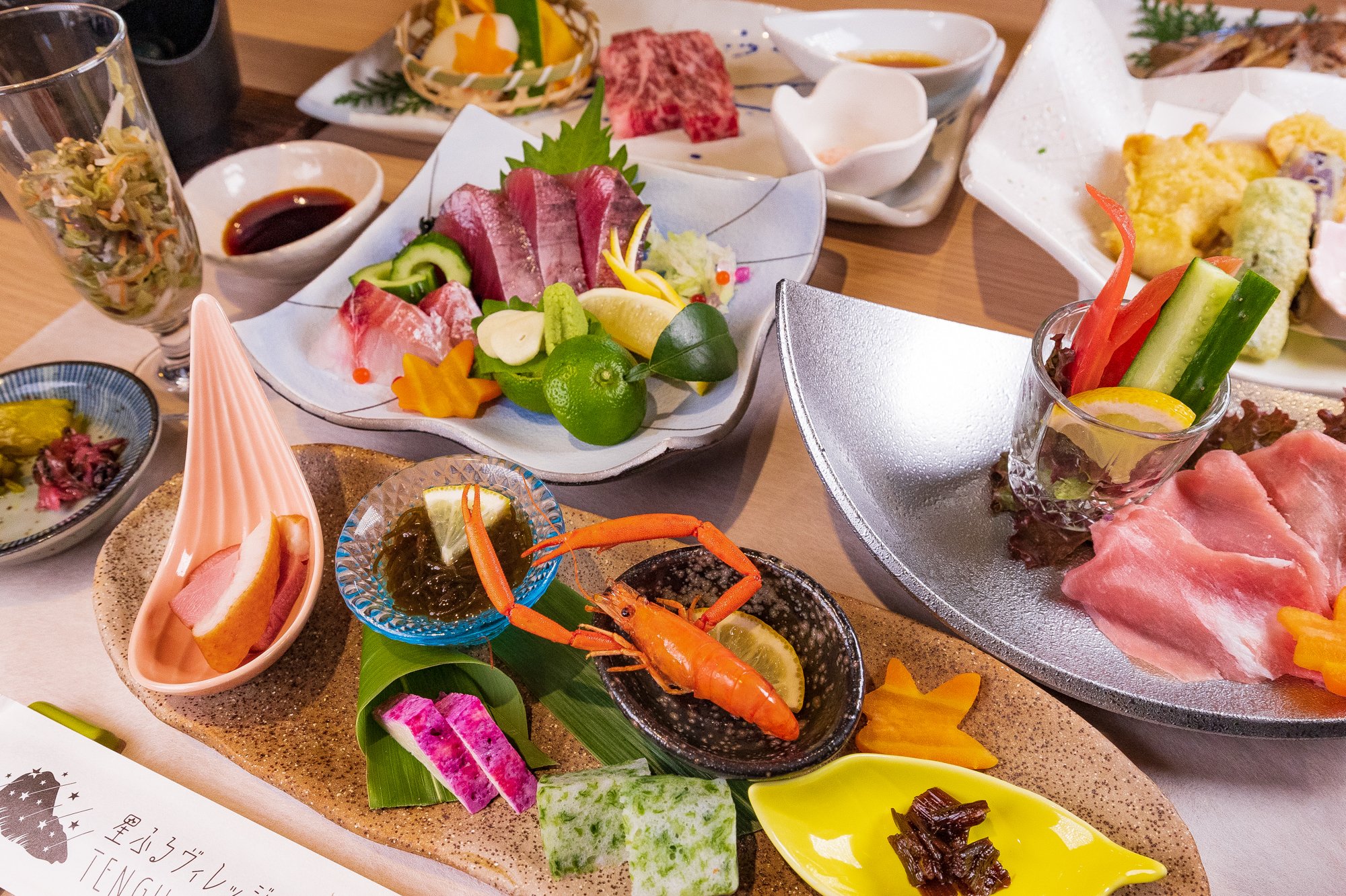 저녁 식사는 「텐구의 선」, 「청류의 선」, 「야마사토의 선」의 3개의 코스 중에서 선택할 수 있습니다.어느 코스도 제철 식재료를 소중히, 산채에서 신선도가 높은 생선회, 자랑의 고기 요리까지 다양한 「고치」를 맛볼 수 있습니다.