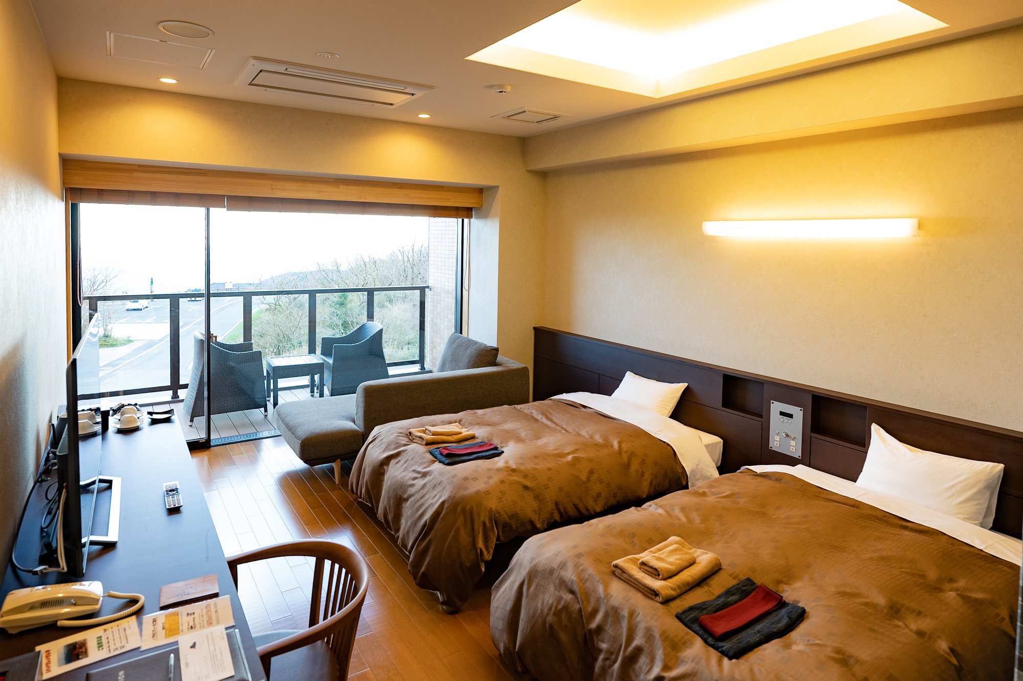 메조넷 타입의 이 방은 객실 내에 있는 계단을 올라가면 큰 창문과 느긋하게 편히 쉬는 소파가 준비된 천체 관측 룸을 완비산 정상에 지어져 있기 때문에 올려다보면 하늘 일면의 밤하늘.