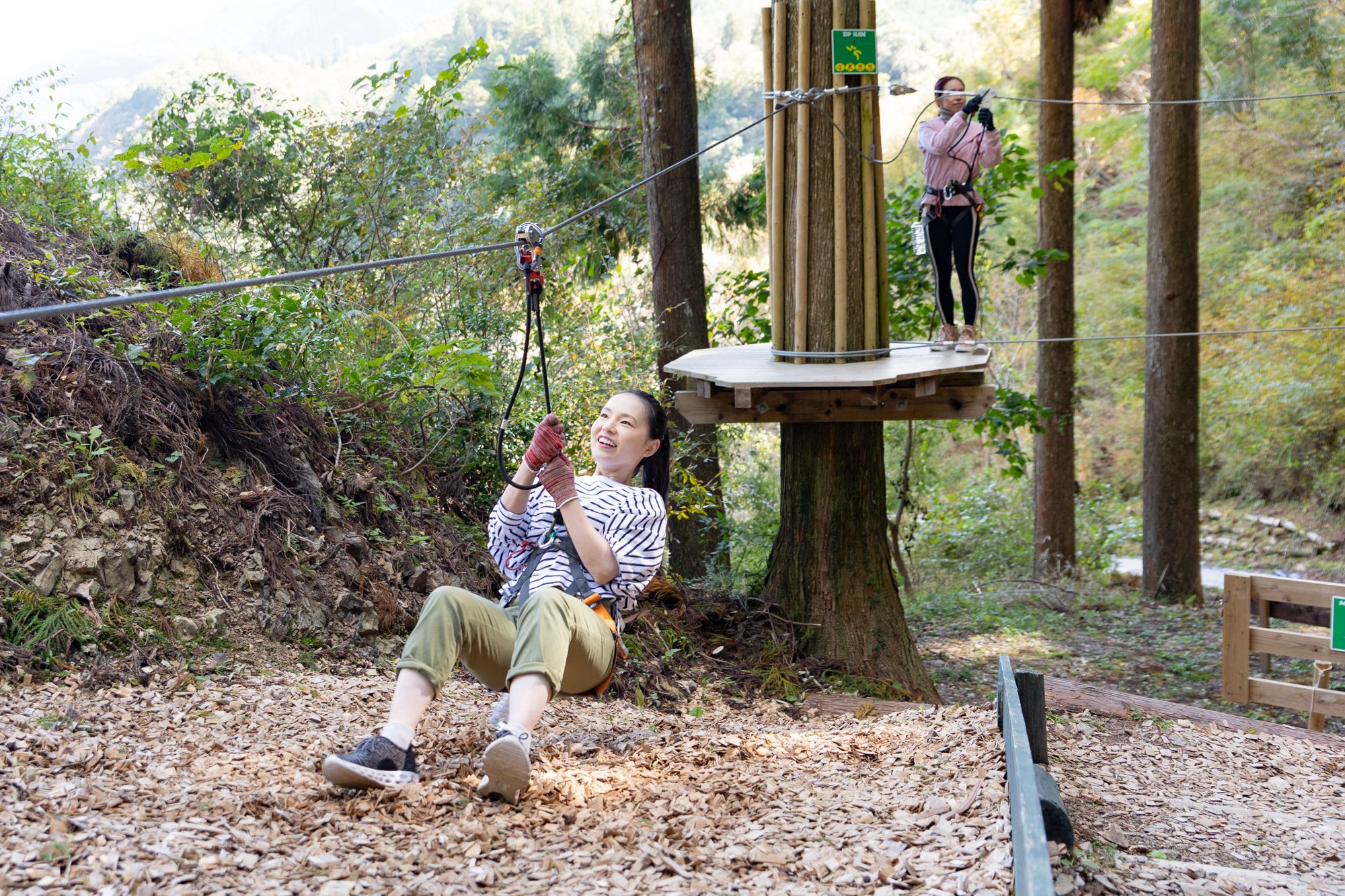 어드벤처 코스의 지플라인은 지상으로부터의 높이 최대 40m, 전체 길이는 337m라는 현내 최대의 길이. 쓰노마치의 산들을 바라보면서 숲 속을 횡단하는 지플라인은 무서움도 날아가는 상쾌감으로, 양손을 넓혀 활주하면 일상에서는 맛볼 수 없는 부유감과 스릴을 맛볼 수 있습니다