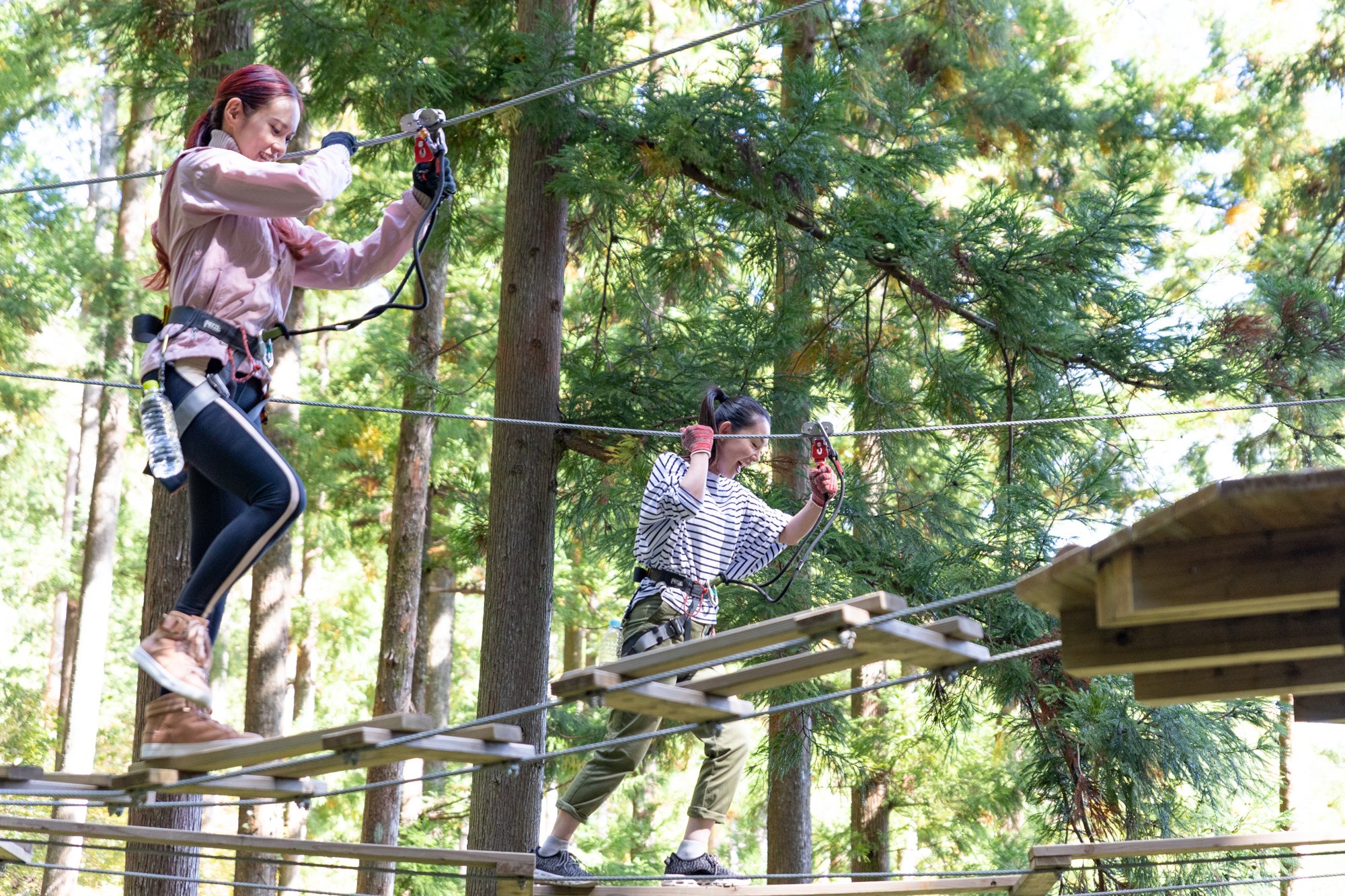 지상에서 높이 10m 이상 있는 나무 위를 이동하면서 숲 속의 공중을 건너 숲의 고저차를 이용한 다이나믹하고 스릴 수 있는 「어드벤처 코스」